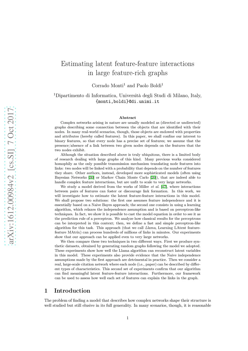 Real-world complex networks describe connections between objects; in reality, those objects are often endowed with some kind of features. How does the presence or absence of such features interplay with the network link structure? Although the situation here described is truly ubiquitous, there is a limited body of research dealing with large graphs of this kind. Many previous works considered homophily as the only possible transmission mechanism translating node features into links. Other authors, instead, developed more sophisticated models, that are able to handle complex feature interactions, but are unfit to scale to very large networks. We expand on the MGJ model, where interactions between pairs of features can foster or discourage link formation. In this work, we will investigate how to estimate the latent feature-feature interactions in this model. We shall propose two solutions: the first one assumes feature independence and it is essentially based on Naive Bayes; the second one, which relaxes the independence assumption assumption, is based on perceptrons. In fact, we show it is possible to cast the model equation in order to see it as the prediction rule of a perceptron. We analyze how classical results for the perceptrons can be interpreted in this context; then, we define a fast and simple perceptron-like algorithm for this task, which can process links in minutes. We then compare these two techniques, first with synthetic datasets that follows our model, gaining evidence that the Naive independence assumptions are detrimental in practice. Secondly, we consider a real, large-scale citation network where each node (i.e., paper) can be described by different types of characteristics; there, our algorithm can assess how well each set of features can explain the links, and thus finding meaningful latent feature-feature interactions.