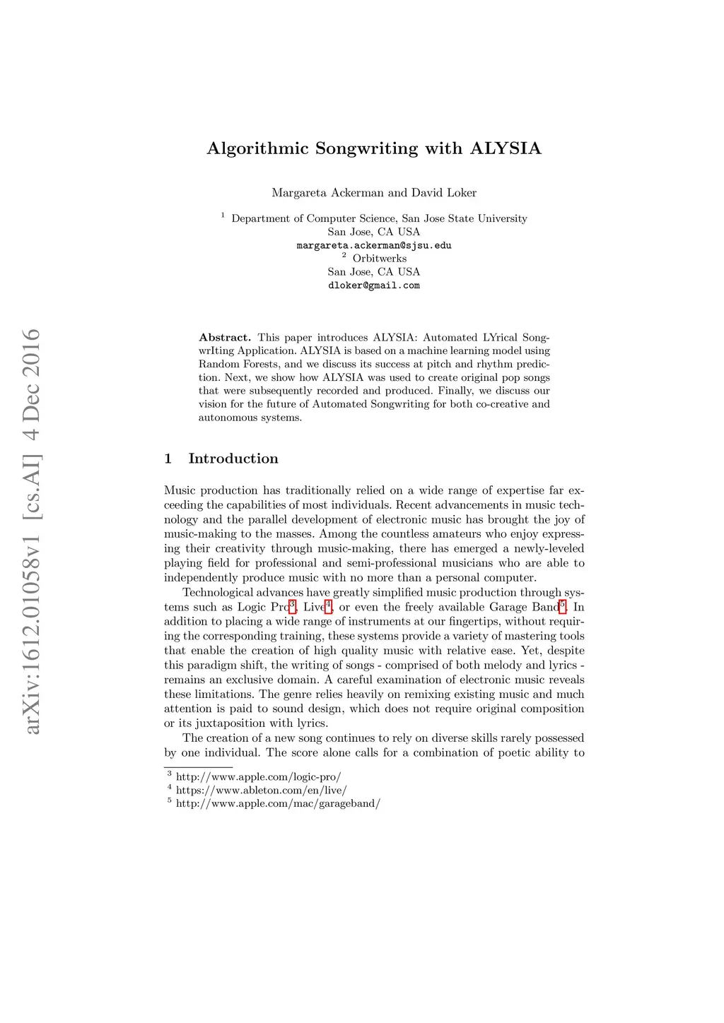 This paper introduces ALYSIA: Automated LYrical SongwrIting Application. ALYSIA is based on a machine learning model using Random Forests, and we discuss its success at pitch and rhythm prediction. Next, we show how ALYSIA was used to create original pop songs that were subsequently recorded and produced. Finally, we discuss our vision for the future of Automated Songwriting for both co-creative and autonomous systems.