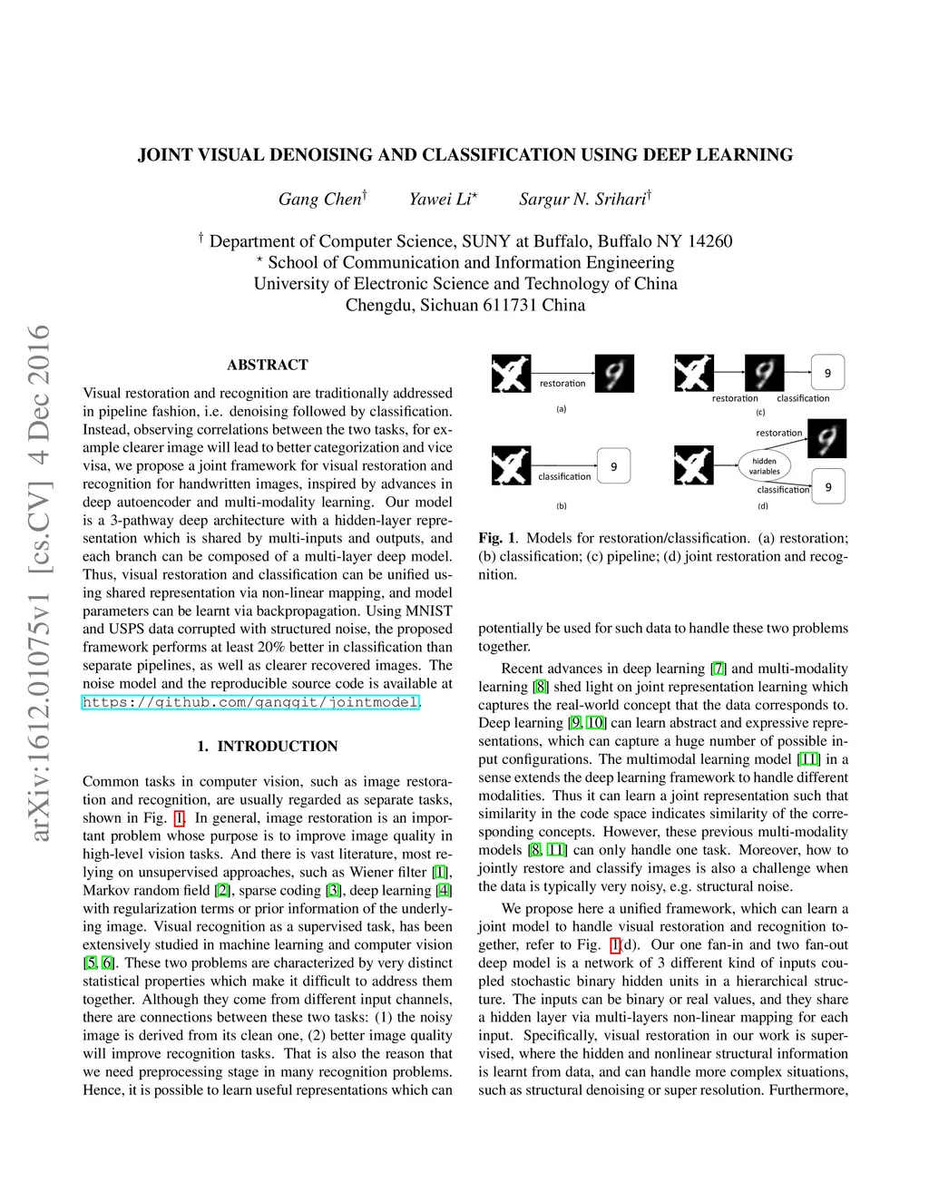 Visual restoration and recognition are traditionally addressed in pipeline fashion, i.e. denoising followed by classification. Instead, observing correlations between the two tasks, for example clearer image will lead to better categorization and vice visa, we propose a joint framework for visual restoration and recognition for handwritten images, inspired by advances in deep autoencoder and multi-modality learning. Our model is a 3-pathway deep architecture with a hidden-layer representation which is shared by multi-inputs and outputs, and each branch can be composed of a multi-layer deep model. Thus, visual restoration and classification can be unified using shared representation via non-linear mapping, and model parameters can be learnt via backpropagation. Using MNIST and USPS data corrupted with structured noise, the proposed framework performs at least 20\% better in classification than separate pipelines, as well as clearer recovered images. The noise model and the reproducible source code is available at {\url{https://github.com/ganggit/jointmodel}}.