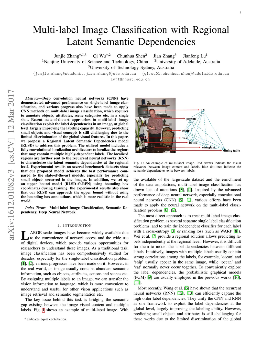 Deep convolution neural networks (CNN) have demonstrated advanced performance on single-label image classification, and various progress also have been made to apply CNN methods on multi-label image classification, which requires to annotate objects, attributes, scene categories etc. in a single shot. Recent state-of-the-art approaches to multi-label image classification exploit the label dependencies in an image, at global level, largely improving the labeling capacity. However, predicting small objects and visual concepts is still challenging due to the limited discrimination of the global visual features. In this paper, we propose a Regional Latent Semantic Dependencies model (RLSD) to address this problem. The utilized model includes a fully convolutional localization architecture to localize the regions that may contain multiple highly-dependent labels. The localized regions are further sent to the recurrent neural networks (RNN) to characterize the latent semantic dependencies at the regional level. Experimental results on several benchmark datasets show that our proposed model achieves the best performance compared to the state-of-the-art models, especially for predicting small objects occurred in the images. In addition, we set up an upper bound model (RLSD+ft-RPN) using bounding box coordinates during training, the experimental results also show that our RLSD can approach the upper bound without using the bounding-box annotations, which is more realistic in the real world.