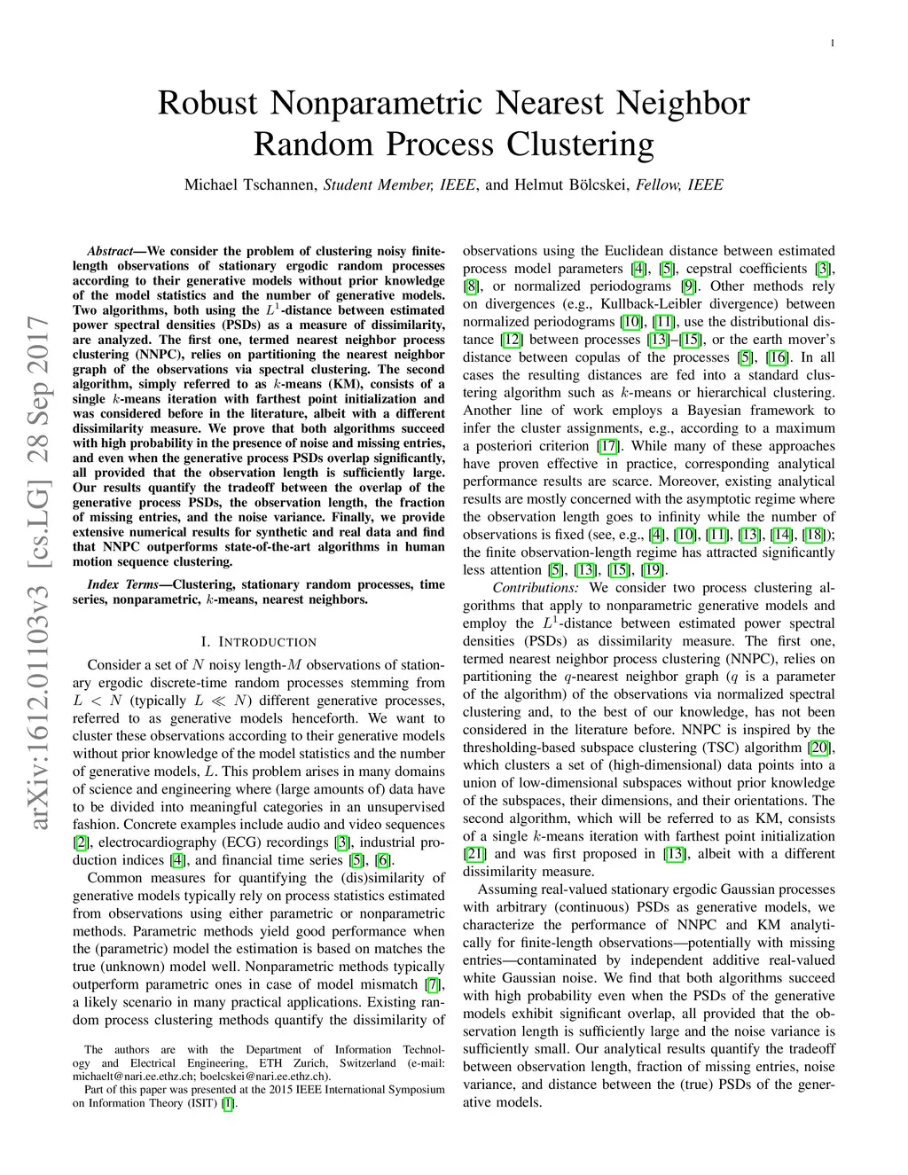 We consider the problem of clustering noisy finite-length observations of stationary ergodic random processes according to their generative models without prior knowledge of the model statistics and the number of generative models. Two algorithms, both using the -distance between estimated power spectral densities (PSDs) as a measure of dissimilarity, are analyzed. The first one, termed nearest neighbor process clustering (NNPC), relies on partitioning the nearest neighbor graph of the observations via spectral clustering. The second algorithm, simply referred to as -means (KM), consists of a single -means iteration with farthest point initialization and was considered before in the literature, albeit with a different dissimilarity measure. We prove that both algorithms succeed with high probability in the presence of noise and missing entries, and even when the generative process PSDs overlap significantly, all provided that the observation length is sufficiently large. Our results quantify the tradeoff between the overlap of the generative process PSDs, the observation length, the fraction of missing entries, and the noise variance. Finally, we provide extensive numerical results for synthetic and real data and find that NNPC outperforms state-of-the-art algorithms in human motion sequence clustering.
