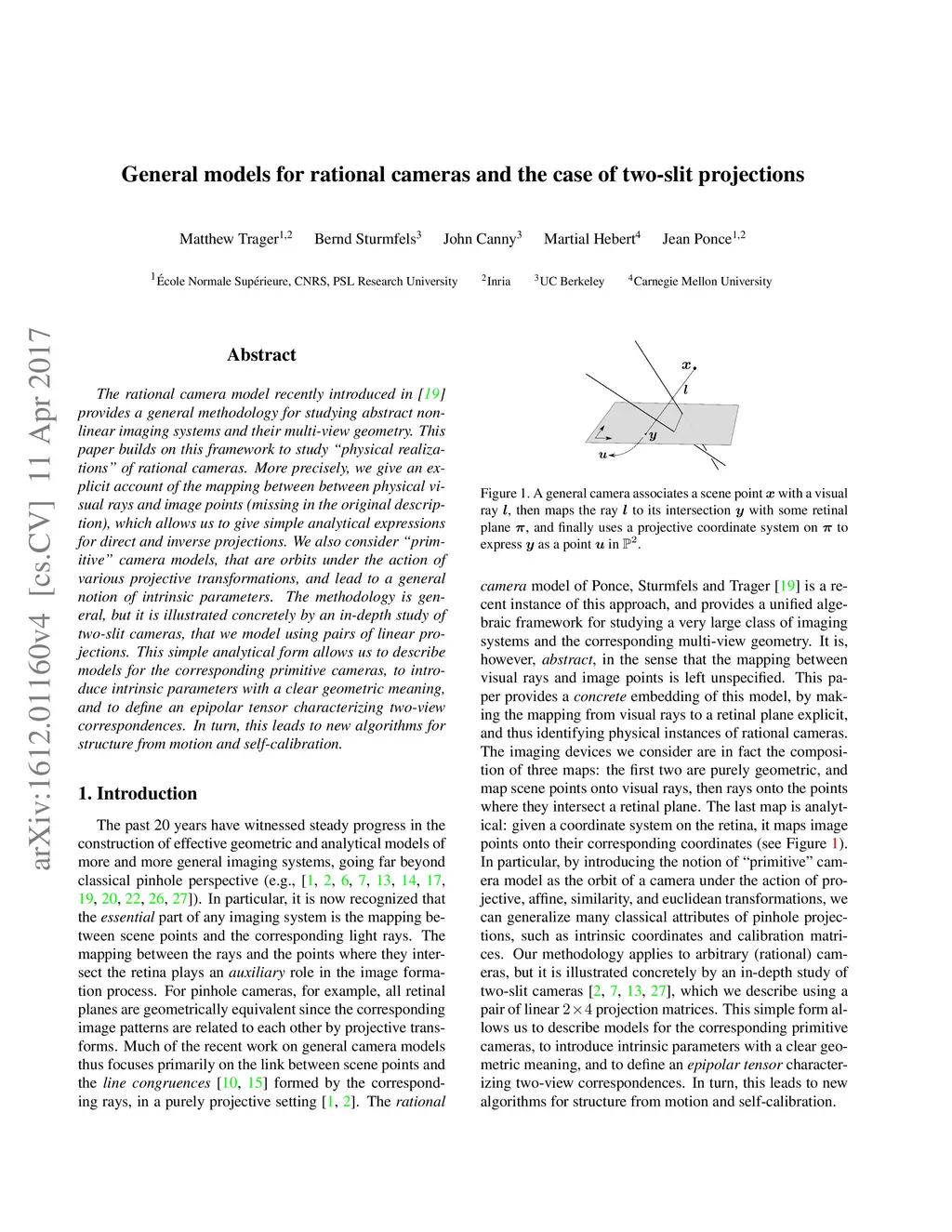 The rational camera model recently introduced in [19] provides a general methodology for studying abstract nonlinear imaging systems and their multi-view geometry. This paper builds on this framework to study "physical realizations" of rational cameras. More precisely, we give an explicit account of the mapping between between physical visual rays and image points (missing in the original description), which allows us to give simple analytical expressions for direct and inverse projections. We also consider "primitive" camera models, that are orbits under the action of various projective transformations, and lead to a general notion of intrinsic parameters. The methodology is general, but it is illustrated concretely by an in-depth study of two-slit cameras, that we model using pairs of linear projections. This simple analytical form allows us to describe models for the corresponding primitive cameras, to introduce intrinsic parameters with a clear geometric meaning, and to define an epipolar tensor characterizing two-view correspondences. In turn, this leads to new algorithms for structure from motion and self-calibration.