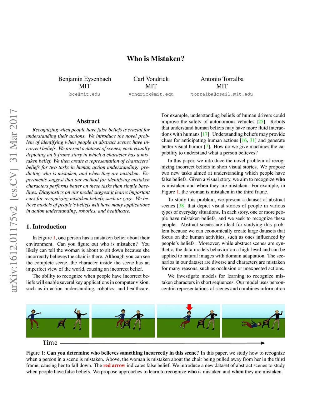 Recognizing when people have false beliefs is crucial for understanding their actions. We introduce the novel problem of identifying when people in abstract scenes have incorrect beliefs. We present a dataset of scenes, each visually depicting an 8-frame story in which a character has a mistaken belief. We then create a representation of characters' beliefs for two tasks in human action understanding: predicting who is mistaken, and when they are mistaken. Experiments suggest that our method for identifying mistaken characters performs better on these tasks than simple baselines. Diagnostics on our model suggest it learns important cues for recognizing mistaken beliefs, such as gaze. We believe models of people's beliefs will have many applications in action understanding, robotics, and healthcare.