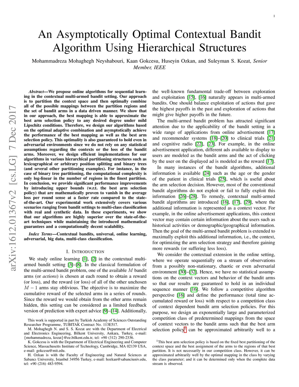We propose online algorithms for sequential learning in the contextual multi-armed bandit setting. Our approach is to partition the context space and then optimally combine all of the possible mappings between the partition regions and the set of bandit arms in a data driven manner. We show that in our approach, the best mapping is able to approximate the best arm selection policy to any desired degree under mild Lipschitz conditions. Therefore, we design our algorithms based on the optimal adaptive combination and asymptotically achieve the performance of the best mapping as well as the best arm selection policy. This optimality is also guaranteed to hold even in adversarial environments since we do not rely on any statistical assumptions regarding the contexts or the loss of the bandit arms. Moreover, we design efficient implementations for our algorithms in various hierarchical partitioning structures such as lexicographical or arbitrary position splitting and binary trees (and several other partitioning examples). For instance, in the case of binary tree partitioning, the computational complexity is only log-linear in the number of regions in the finest partition. In conclusion, we provide significant performance improvements by introducing upper bounds (w.r.t. the best arm selection policy) that are mathematically proven to vanish in the average loss per round sense at a faster rate compared to the state-of-the-art. Our experimental work extensively covers various scenarios ranging from bandit settings to multi-class classification with real and synthetic data. In these experiments, we show that our algorithms are highly superior over the state-of-the-art techniques while maintaining the introduced mathematical guarantees and a computationally decent scalability.