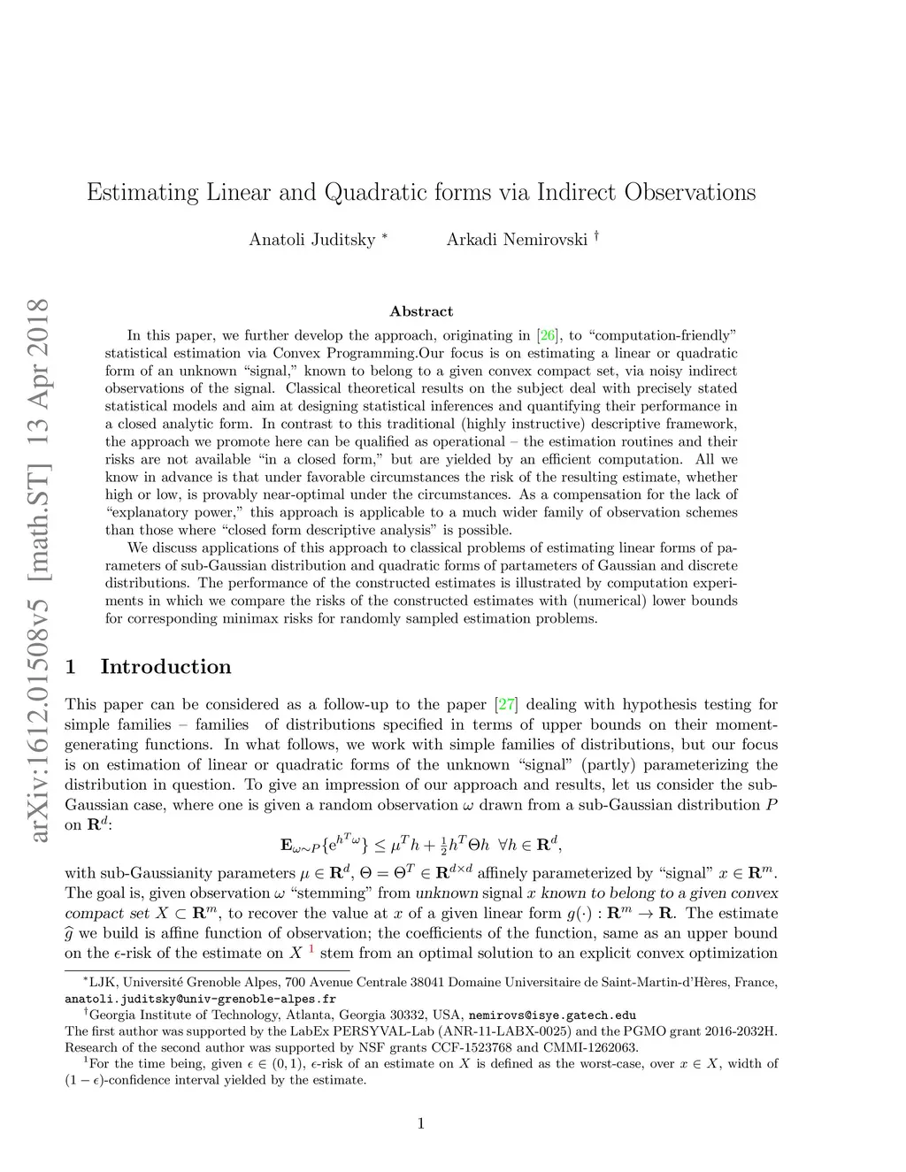 In this paper, we further develop the approach, originating in [14 (arXiv:1311.6765),20 (arXiv:1604.02576)], to "computation-friendly" hypothesis testing and statistical estimation via Convex Programming. Specifically, we focus on estimating a linear or quadratic form of an unknown "signal," known to belong to a given convex compact set, via noisy indirect observations of the signal. Most of the existing theoretical results on the subject deal with precisely stated statistical models and aim at designing statistical inferences and quantifying their performance in a closed analytic form. In contrast to this descriptive (and highly instructive) traditional framework, the approach we promote here can be qualified as operational -- the estimation routines and their risks are yielded by an efficient computation. All we know in advance is that under favorable circumstances to be specified below, the risk of the resulting estimate, whether high or low, is provably near-optimal under the circumstances. As a compensation for the lack of "explanatory power," this approach is applicable to a much wider family of observation schemes than those where "closed form descriptive analysis" is possible. The paper is a follow-up to our paper [20 (arXiv:1604.02576)] dealing with hypothesis testing, in what follows, we apply the machinery developed in this reference to estimating linear and quadratic forms.