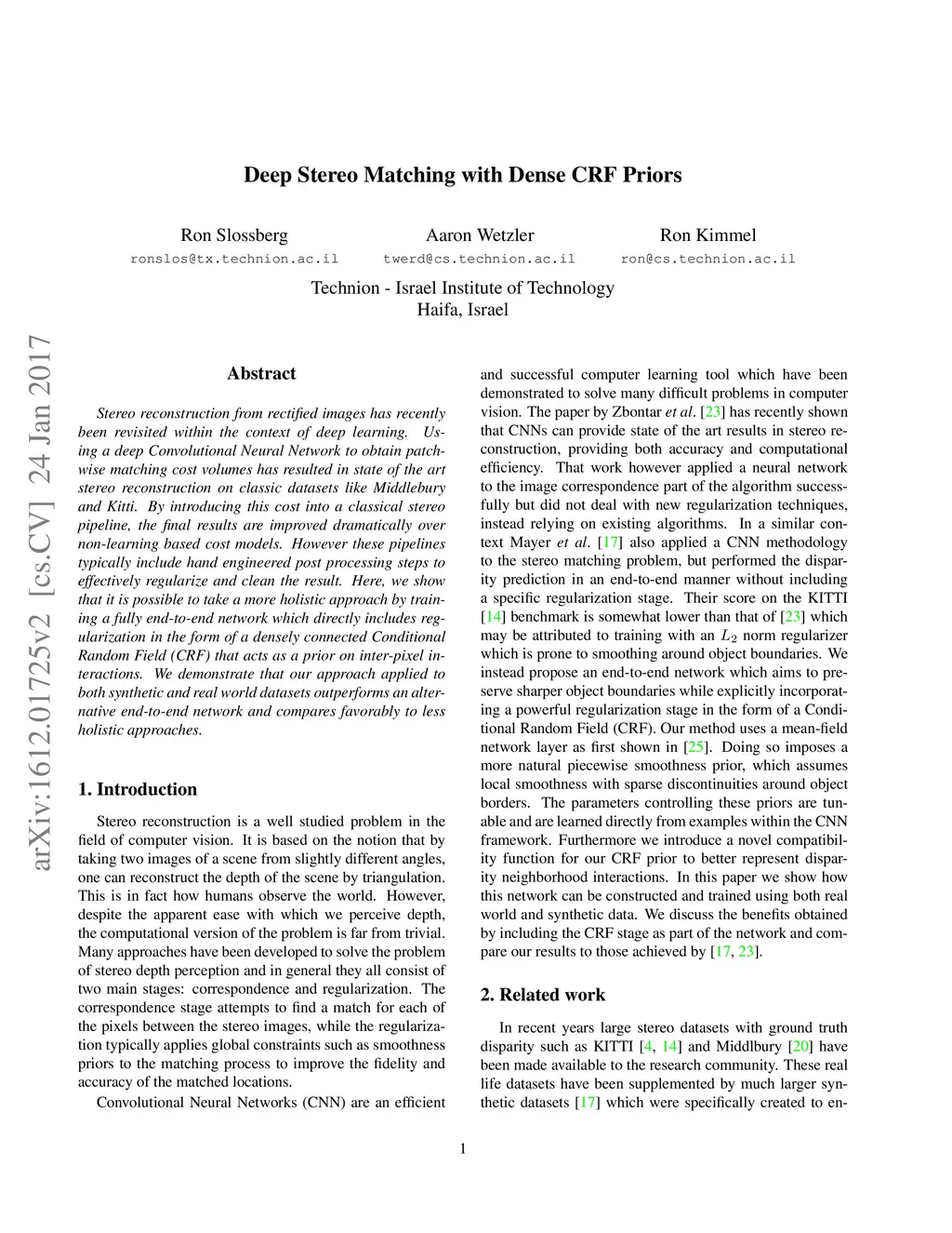 Stereo reconstruction from rectified images has recently been revisited within the context of deep learning. Using a deep Convolutional Neural Network to obtain patch-wise matching cost volumes has resulted in state of the art stereo reconstruction on classic datasets like Middlebury and Kitti. By introducing this cost into a classical stereo pipeline, the final results are improved dramatically over non-learning based cost models. However these pipelines typically include hand engineered post processing steps to effectively regularize and clean the result. Here, we show that it is possible to take a more holistic approach by training a fully end-to-end network which directly includes regularization in the form of a densely connected Conditional Random Field (CRF) that acts as a prior on inter-pixel interactions. We demonstrate that our approach on both synthetic and real world datasets outperforms an alternative end-to-end network and compares favorably to more hand engineered approaches.