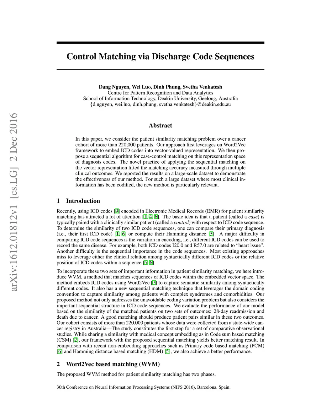 In this paper, we consider the patient similarity matching problem over a cancer cohort of more than 220,000 patients. Our approach first leverages on Word2Vec framework to embed ICD codes into vector-valued representation. We then propose a sequential algorithm for case-control matching on this representation space of diagnosis codes. The novel practice of applying the sequential matching on the vector representation lifted the matching accuracy measured through multiple clinical outcomes. We reported the results on a large-scale dataset to demonstrate the effectiveness of our method. For such a large dataset where most clinical information has been codified, the new method is particularly relevant.