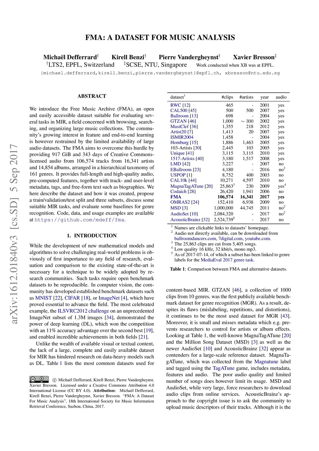 We introduce the Free Music Archive (FMA), an open and easily accessible dataset suitable for evaluating several tasks in MIR, a field concerned with browsing, searching, and organizing large music collections. The community's growing interest in feature and end-to-end learning is however restrained by the limited availability of large audio datasets. The FMA aims to overcome this hurdle by providing 917 GiB and 343 days of Creative Commons-licensed audio from 106,574 tracks from 16,341 artists and 14,854 albums, arranged in a hierarchical taxonomy of 161 genres. It provides full-length and high-quality audio, pre-computed features, together with track- and user-level metadata, tags, and free-form text such as biographies. We here describe the dataset and how it was created, propose a train/validation/test split and three subsets, discuss some suitable MIR tasks, and evaluate some baselines for genre recognition. Code, data, and usage examples are available at https://github.com/mdeff/fma