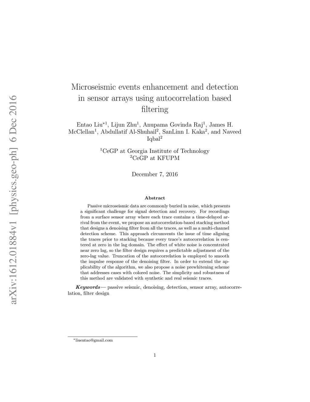 Passive microseismic data are commonly buried in noise, which presents a significant challenge for signal detection and recovery. For recordings from a surface sensor array where each trace contains a time-delayed arrival from the event, we propose an autocorrelation-based stacking method that designs a denoising filter from all the traces, as well as a multi-channel detection scheme. This approach circumvents the issue of time aligning the traces prior to stacking because every trace's autocorrelation is centered at zero in the lag domain. The effect of white noise is concentrated near zero lag, so the filter design requires a predictable adjustment of the zero-lag value. Truncation of the autocorrelation is employed to smooth the impulse response of the denoising filter. In order to extend the applicability of the algorithm, we also propose a noise prewhitening scheme that addresses cases with colored noise. The simplicity and robustness of this method are validated with synthetic and real seismic traces.