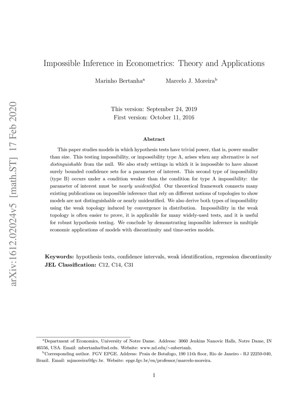 This paper studies models in which hypothesis tests have trivial power, that is, power smaller than size. This testing impossibility, or impossibility type A, arises when any alternative is not distinguishable from the null. We also study settings in which it is impossible to have almost surely bounded confidence sets for a parameter of interest. This second type of impossibility (type B) occurs under a condition weaker than the condition for type A impossibility: the parameter of interest must be nearly unidentified. Our theoretical framework connects many existing publications on impossible inference that rely on different notions of topologies to show models are not distinguishable or nearly unidentified. We also derive both types of impossibility using the weak topology induced by convergence in distribution. Impossibility in the weak topology is often easier to prove, it is applicable for many widely-used tests, and it is useful for robust hypothesis testing. We conclude by demonstrating impossible inference in multiple economic applications of models with discontinuity and time-series models.