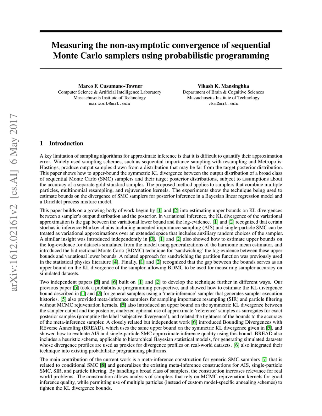 A key limitation of sampling algorithms for approximate inference is that it is difficult to quantify their approximation error. Widely used sampling schemes, such as sequential importance sampling with resampling and Metropolis-Hastings, produce output samples drawn from a distribution that may be far from the target posterior distribution. This paper shows how to upper-bound the symmetric KL divergence between the output distribution of a broad class of sequential Monte Carlo (SMC) samplers and their target posterior distributions, subject to assumptions about the accuracy of a separate gold-standard sampler. The proposed method applies to samplers that combine multiple particles, multinomial resampling, and rejuvenation kernels. The experiments show the technique being used to estimate bounds on the divergence of SMC samplers for posterior inference in a Bayesian linear regression model and a Dirichlet process mixture model.