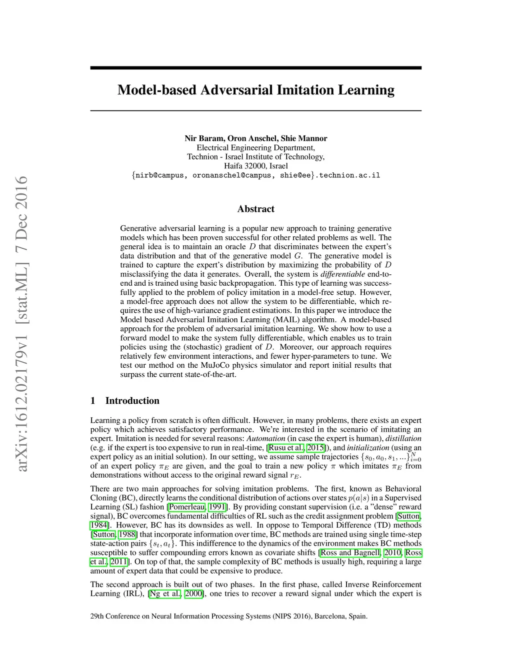 Generative adversarial learning is a popular new approach to training generative models which has been proven successful for other related problems as well. The general idea is to maintain an oracle that discriminates between the expert's data distribution and that of the generative model . The generative model is trained to capture the expert's distribution by maximizing the probability of misclassifying the data it generates. Overall, the system is \emph{differentiable} end-to-end and is trained using basic backpropagation. This type of learning was successfully applied to the problem of policy imitation in a model-free setup. However, a model-free approach does not allow the system to be differentiable, which requires the use of high-variance gradient estimations. In this paper we introduce the Model based Adversarial Imitation Learning (MAIL) algorithm. A model-based approach for the problem of adversarial imitation learning. We show how to use a forward model to make the system fully differentiable, which enables us to train policies using the (stochastic) gradient of . Moreover, our approach requires relatively few environment interactions, and fewer hyper-parameters to tune. We test our method on the MuJoCo physics simulator and report initial results that surpass the current state-of-the-art.