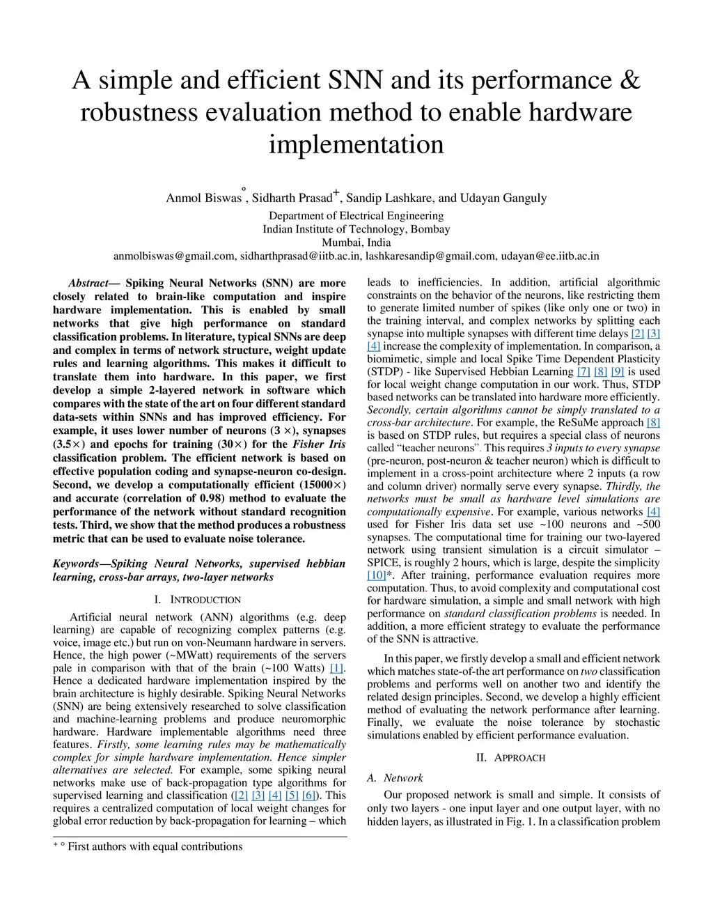 Spiking Neural Networks (SNN) are more closely related to brain-like computation and inspire hardware implementation. This is enabled by small networks that give high performance on standard classification problems. In literature, typical SNNs are deep and complex in terms of network structure, weight update rules and learning algorithms. This makes it difficult to translate them into hardware. In this paper, we first develop a simple 2-layered network in software which compares with the state of the art on four different standard data-sets within SNNs and has improved efficiency. For example, it uses lower number of neurons (3 x), synapses (3.5 x) and epochs for training (30 x) for the Fisher Iris classification problem. The efficient network is based on effective population coding and synapse-neuron co-design. Second, we develop a computationally efficient (15000 x) and accurate (correlation of 0.98) method to evaluate the performance of the network without standard recognition tests. Third, we show that the method produces a robustness metric that can be used to evaluate noise tolerance.