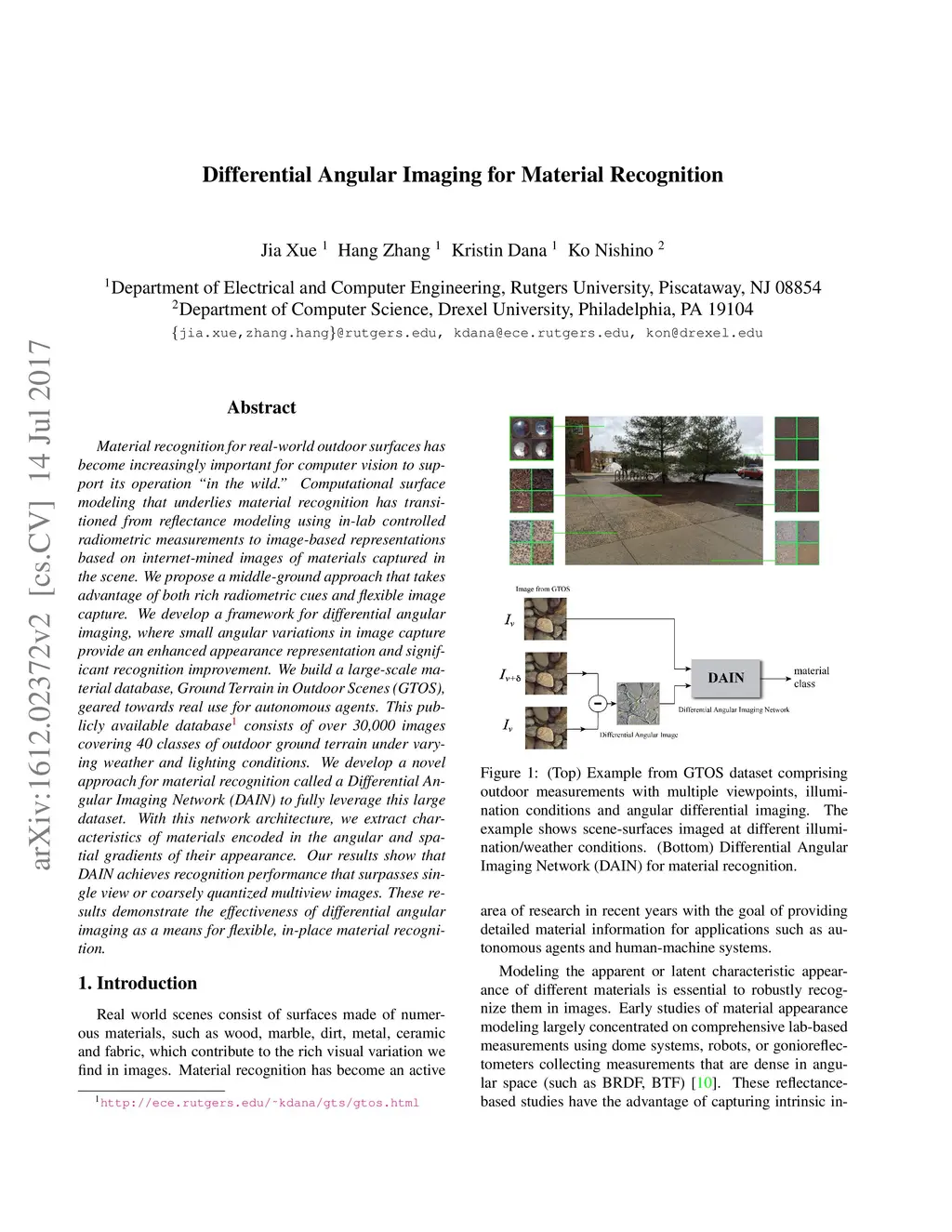 Material recognition for real-world outdoor surfaces has become increasingly important for computer vision to support its operation "in the wild." Computational surface modeling that underlies material recognition has transitioned from reflectance modeling using in-lab controlled radiometric measurements to image-based representations based on internet-mined images of materials captured in the scene. We propose to take a middle-ground approach for material recognition that takes advantage of both rich radiometric cues and flexible image capture. We realize this by developing a framework for differential angular imaging, where small angular variations in image capture provide an enhanced appearance representation and significant recognition improvement. We build a large-scale material database, Ground Terrain in Outdoor Scenes (GTOS) database, geared towards real use for autonomous agents. The database consists of over 30,000 images covering 40 classes of outdoor ground terrain under varying weather and lighting conditions. We develop a novel approach for material recognition called a Differential Angular Imaging Network (DAIN) to fully leverage this large dataset. With this novel network architecture, we extract characteristics of materials encoded in the angular and spatial gradients of their appearance. Our results show that DAIN achieves recognition performance that surpasses single view or coarsely quantized multiview images. These results demonstrate the effectiveness of differential angular imaging as a means for flexible, in-place material recognition.