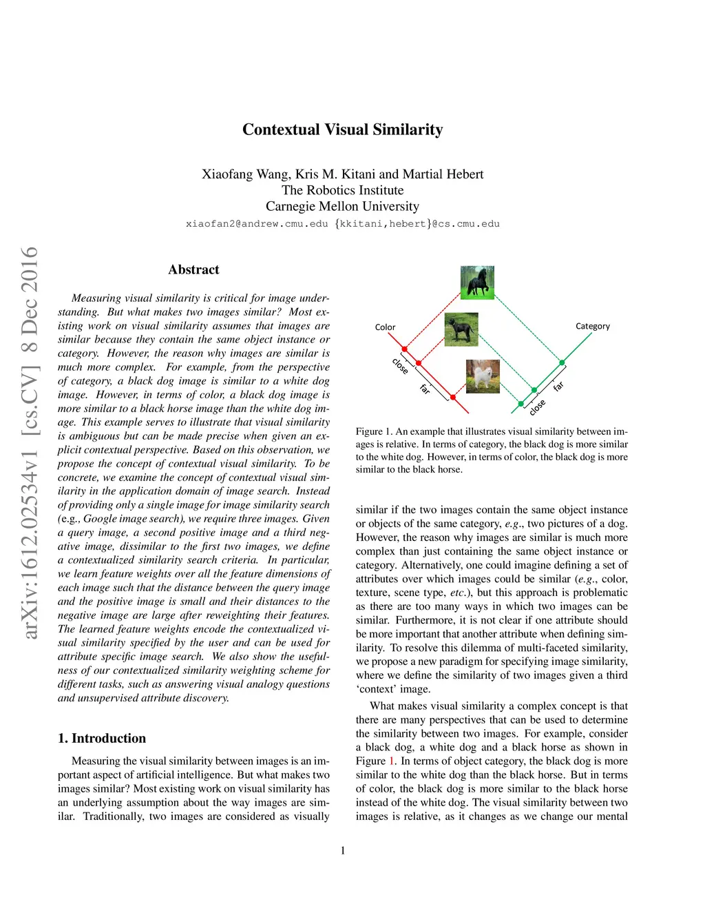Measuring visual similarity is critical for image understanding. But what makes two images similar? Most existing work on visual similarity assumes that images are similar because they contain the same object instance or category. However, the reason why images are similar is much more complex. For example, from the perspective of category, a black dog image is similar to a white dog image. However, in terms of color, a black dog image is more similar to a black horse image than the white dog image. This example serves to illustrate that visual similarity is ambiguous but can be made precise when given an explicit contextual perspective. Based on this observation, we propose the concept of contextual visual similarity. To be concrete, we examine the concept of contextual visual similarity in the application domain of image search. Instead of providing only a single image for image similarity search (\eg, Google image search), we require three images. Given a query image, a second positive image and a third negative image, dissimilar to the first two images, we define a contextualized similarity search criteria. In particular, we learn feature weights over all the feature dimensions of each image such that the distance between the query image and the positive image is small and their distances to the negative image are large after reweighting their features. The learned feature weights encode the contextualized visual similarity specified by the user and can be used for attribute specific image search. We also show the usefulness of our contextualized similarity weighting scheme for different tasks, such as answering visual analogy questions and unsupervised attribute discovery.