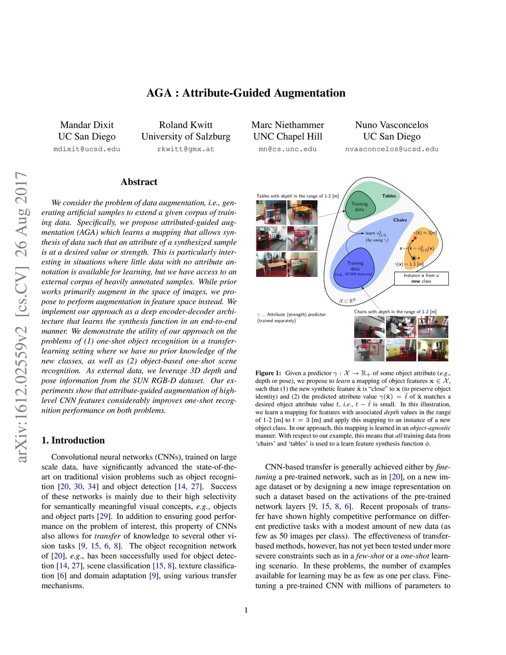 We consider the problem of data augmentation, i.e., generating artificial samples to extend a given corpus of training data. Specifically, we propose attributed-guided augmentation (AGA) which learns a mapping that allows to synthesize data such that an attribute of a synthesized sample is at a desired value or strength. This is particularly interesting in situations where little data with no attribute annotation is available for learning, but we have access to a large external corpus of heavily annotated samples. While prior works primarily augment in the space of images, we propose to perform augmentation in feature space instead. We implement our approach as a deep encoder-decoder architecture that learns the synthesis function in an end-to-end manner. We demonstrate the utility of our approach on the problems of (1) one-shot object recognition in a transfer-learning setting where we have no prior knowledge of the new classes, as well as (2) object-based one-shot scene recognition. As external data, we leverage 3D depth and pose information from the SUN RGB-D dataset. Our experiments show that attribute-guided augmentation of high-level CNN features considerably improves one-shot recognition performance on both problems.