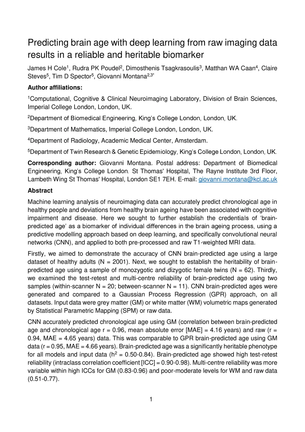 Machine learning analysis of neuroimaging data can accurately predict chronological age in healthy people and deviations from healthy brain ageing have been associated with cognitive impairment and disease. Here we sought to further establish the credentials of "brain-predicted age" as a biomarker of individual differences in the brain ageing process, using a predictive modelling approach based on deep learning, and specifically convolutional neural networks (CNN), and applied to both pre-processed and raw T1-weighted MRI data. Firstly, we aimed to demonstrate the accuracy of CNN brain-predicted age using a large dataset of healthy adults (N = 2001). Next, we sought to establish the heritability of brain-predicted age using a sample of monozygotic and dizygotic female twins (N = 62). Thirdly, we examined the test-retest and multi-centre reliability of brain-predicted age using two samples (within-scanner N = 20; between-scanner N = 11). CNN brain-predicted ages were generated and compared to a Gaussian Process Regression (GPR) approach, on all datasets. Input data were grey matter (GM) or white matter (WM) volumetric maps generated by Statistical Parametric Mapping (SPM) or raw data. Brain-predicted age represents an accurate, highly reliable and genetically-valid phenotype, that has potential to be used as a biomarker of brain ageing. Moreover, age predictions can be accurately generated on raw T1-MRI data, substantially reducing computation time for novel data, bringing the process closer to giving real-time information on brain health in clinical settings.