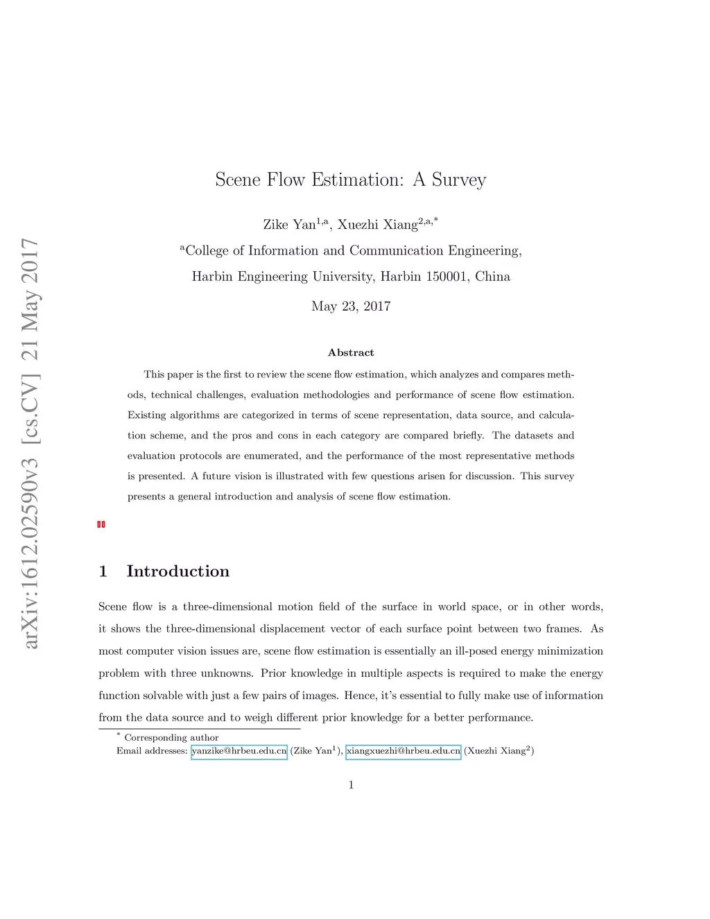 This paper is the first to review the scene flow estimation field, which analyzes and compares methods, technical challenges, evaluation methodologies and performance of scene flow estimation. Existing algorithms are categorized in terms of scene representation, data source, and calculation scheme, and the pros and cons in each category are compared briefly. The datasets and evaluation protocols are enumerated, and the performance of the most representative methods is presented. A future vision is illustrated with few questions arisen for discussion. This survey presents a general introduction and analysis of scene flow estimation.