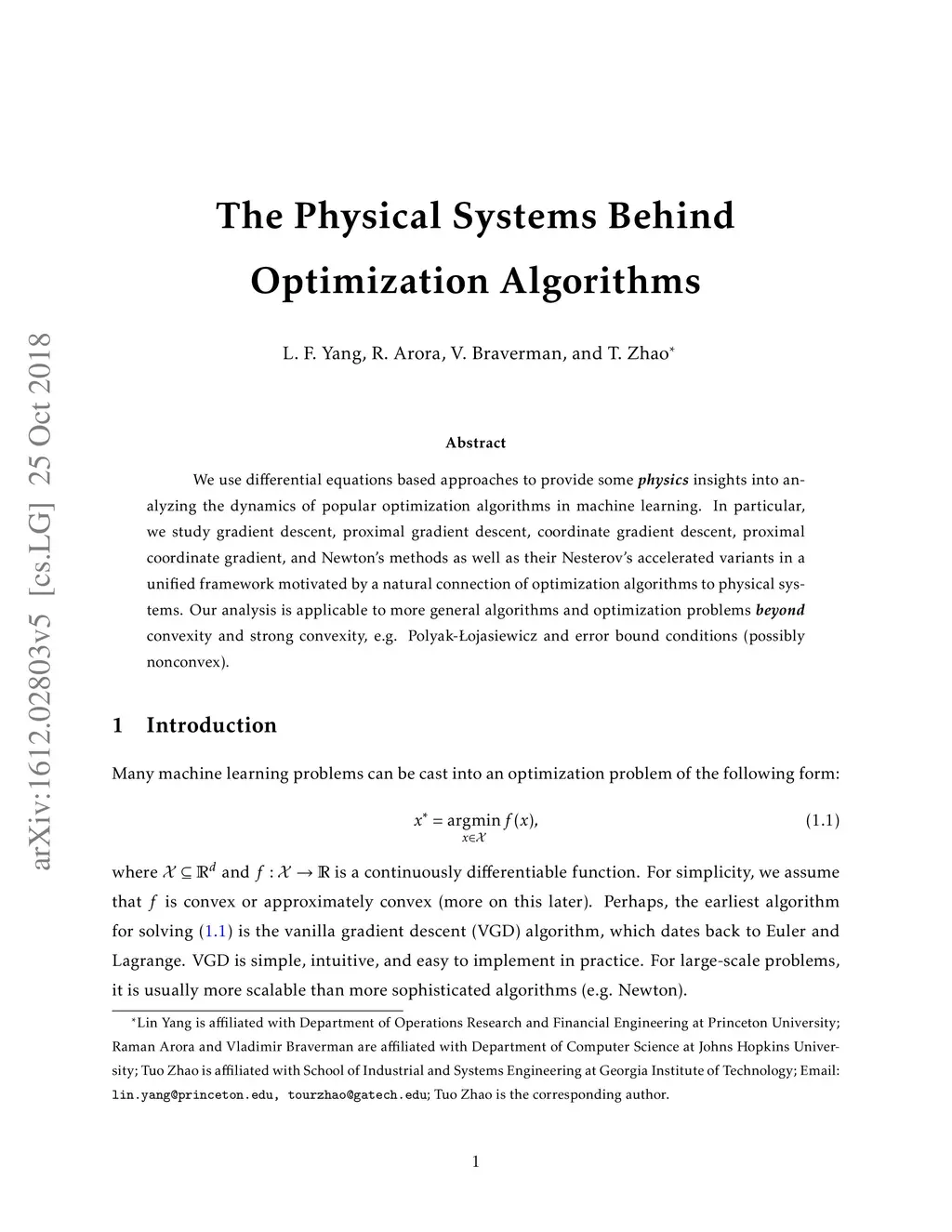 We use differential equations based approaches to provide some {\it \textbf{physics}} insights into analyzing the dynamics of popular optimization algorithms in machine learning. In particular, we study gradient descent, proximal gradient descent, coordinate gradient descent, proximal coordinate gradient, and Newton's methods as well as their Nesterov's accelerated variants in a unified framework motivated by a natural connection of optimization algorithms to physical systems. Our analysis is applicable to more general algorithms and optimization problems {\it \textbf{beyond}} convexity and strong convexity, e.g. Polyak-\L ojasiewicz and error bound conditions (possibly nonconvex).