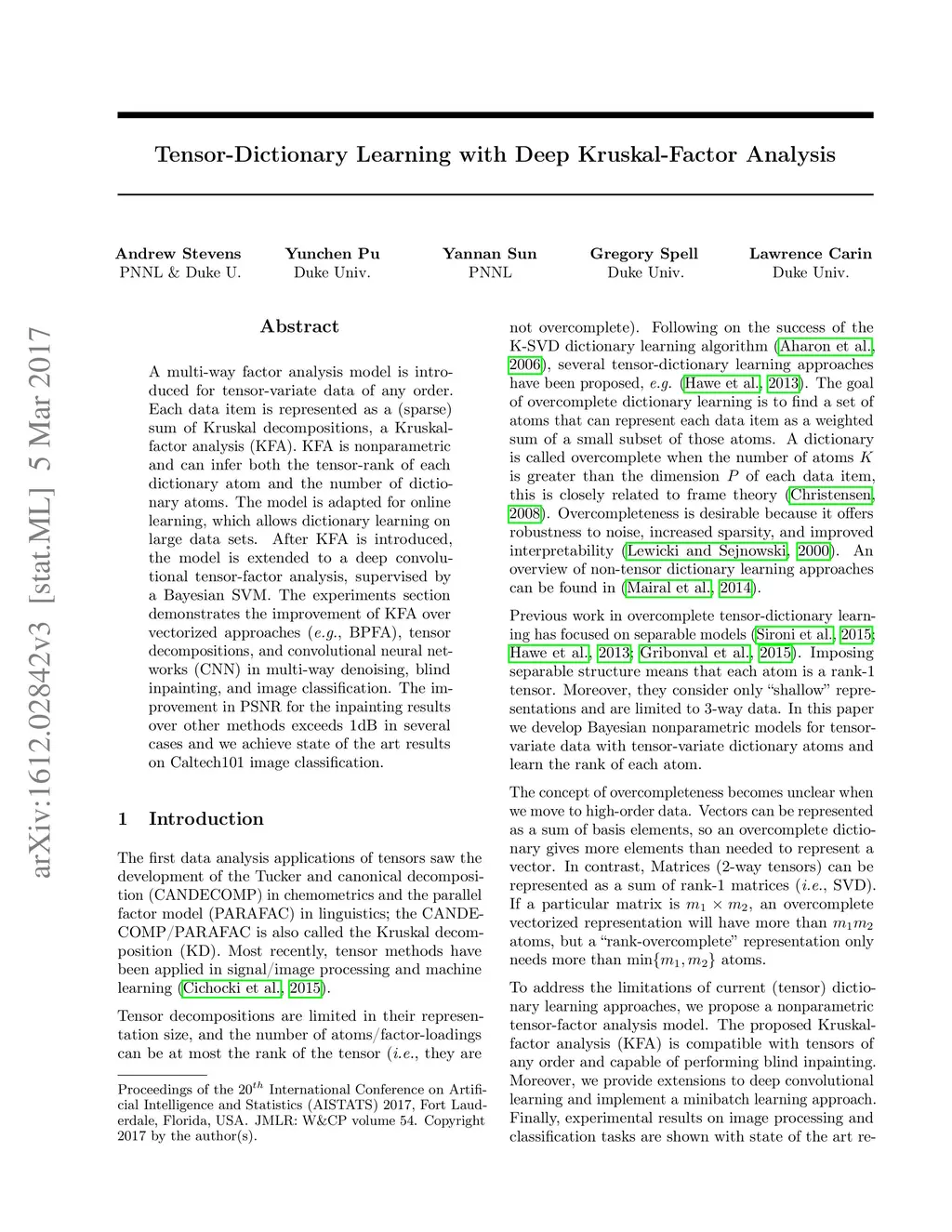 A multi-way factor analysis model is introduced for tensor-variate data of any order. Each data item is represented as a (sparse) sum of Kruskal decompositions, a Kruskal-factor analysis (KFA). KFA is nonparametric and can infer both the tensor-rank of each dictionary atom and the number of dictionary atoms. The model is adapted for online learning, which allows dictionary learning on large data sets. After KFA is introduced, the model is extended to a deep convolutional tensor-factor analysis, supervised by a Bayesian SVM. The experiments section demonstrates the improvement of KFA over vectorized approaches (e.g., BPFA), tensor decompositions, and convolutional neural networks (CNN) in multi-way denoising, blind inpainting, and image classification. The improvement in PSNR for the inpainting results over other methods exceeds 1dB in several cases and we achieve state of the art results on Caltech101 image classification.