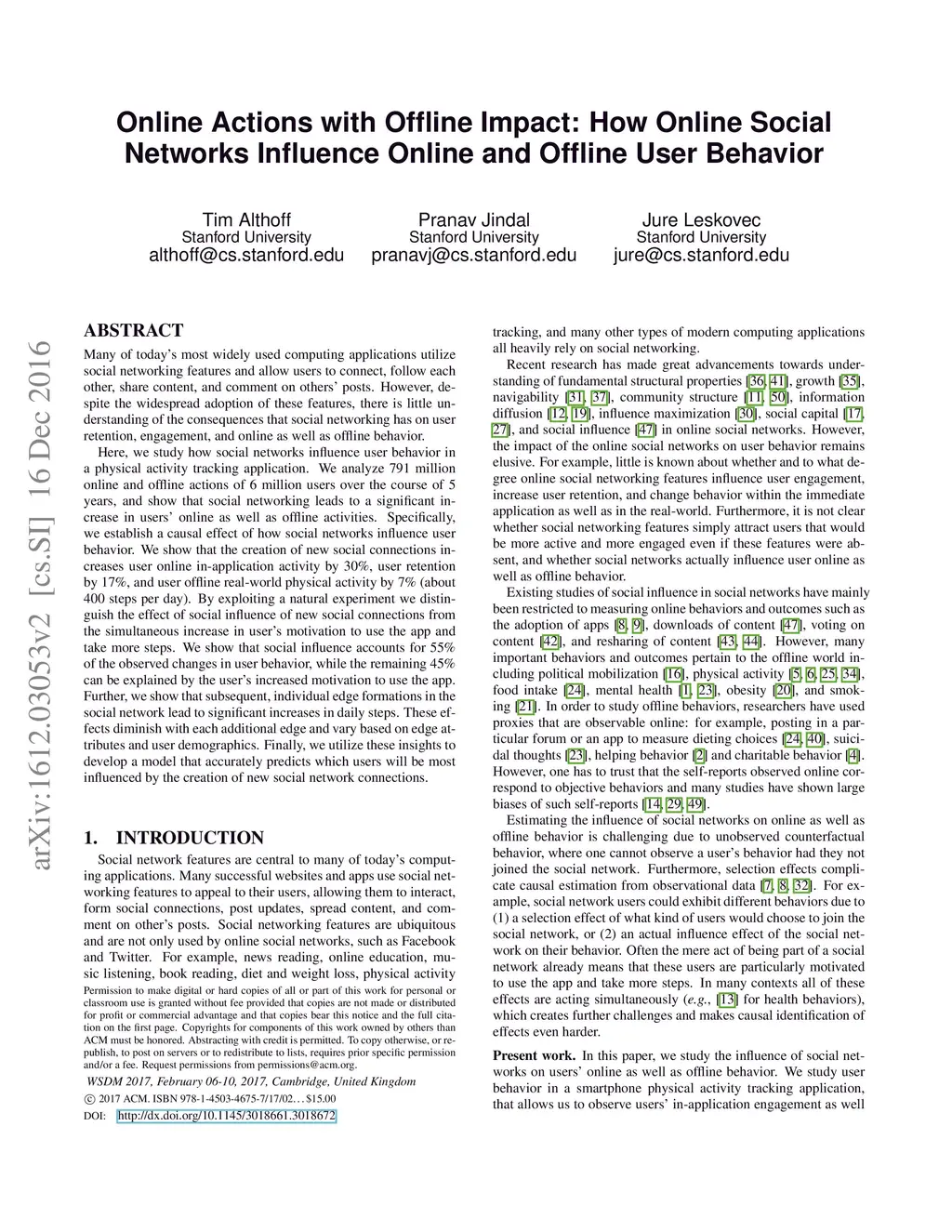 Many of today's most widely used computing applications utilize social networking features and allow users to connect, follow each other, share content, and comment on others' posts. However, despite the widespread adoption of these features, there is little understanding of the consequences that social networking has on user retention, engagement, and online as well as offline behavior. Here, we study how social networks influence user behavior in a physical activity tracking application. We analyze 791 million online and offline actions of 6 million users over the course of 5 years, and show that social networking leads to a significant increase in users' online as well as offline activities. Specifically, we establish a causal effect of how social networks influence user behavior. We show that the creation of new social connections increases user online in-application activity by 30%, user retention by 17%, and user offline real-world physical activity by 7% (about 400 steps per day). By exploiting a natural experiment we distinguish the effect of social influence of new social connections from the simultaneous increase in user's motivation to use the app and take more steps. We show that social influence accounts for 55% of the observed changes in user behavior, while the remaining 45% can be explained by the user's increased motivation to use the app. Further, we show that subsequent, individual edge formations in the social network lead to significant increases in daily steps. These effects diminish with each additional edge and vary based on edge attributes and user demographics. Finally, we utilize these insights to develop a model that accurately predicts which users will be most influenced by the creation of new social network connections.