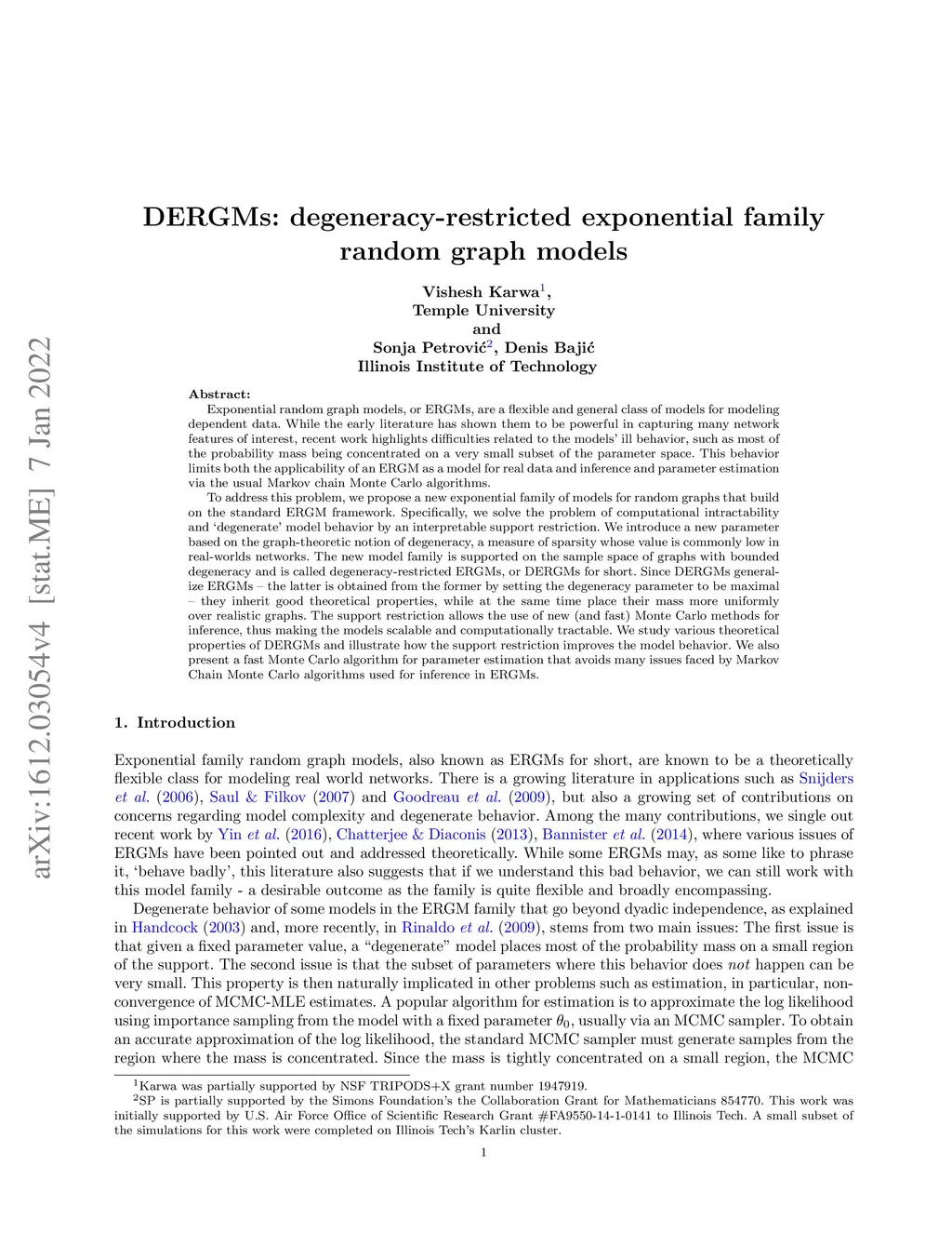 Exponential random graph models, or ERGMs, are a flexible and general class of models for modeling dependent data. While the early literature has shown them to be powerful in capturing many network features of interest, recent work highlights difficulties related to the models' ill behavior, such as most of the probability mass being concentrated on a very small subset of the parameter space. This behavior limits both the applicability of an ERGM as a model for real data and inference and parameter estimation via the usual Markov chain Monte Carlo algorithms. To address this problem, we propose a new exponential family of models for random graphs that build on the standard ERGM framework. Specifically, we solve the problem of computational intractability and `degenerate' model behavior by an interpretable support restriction. We introduce a new parameter based on the graph-theoretic notion of degeneracy, a measure of sparsity whose value is commonly low in real-worlds networks. The new model family is supported on the sample space of graphs with bounded degeneracy and is called degeneracy-restricted ERGMs, or DERGMs for short. Since DERGMs generalize ERGMs -- the latter is obtained from the former by setting the degeneracy parameter to be maximal -- they inherit good theoretical properties, while at the same time place their mass more uniformly over realistic graphs. The support restriction allows the use of new (and fast) Monte Carlo methods for inference, thus making the models scalable and computationally tractable. We study various theoretical properties of DERGMs and illustrate how the support restriction improves the model behavior. We also present a fast Monte Carlo algorithm for parameter estimation that avoids many issues faced by Markov Chain Monte Carlo algorithms used for inference in ERGMs.