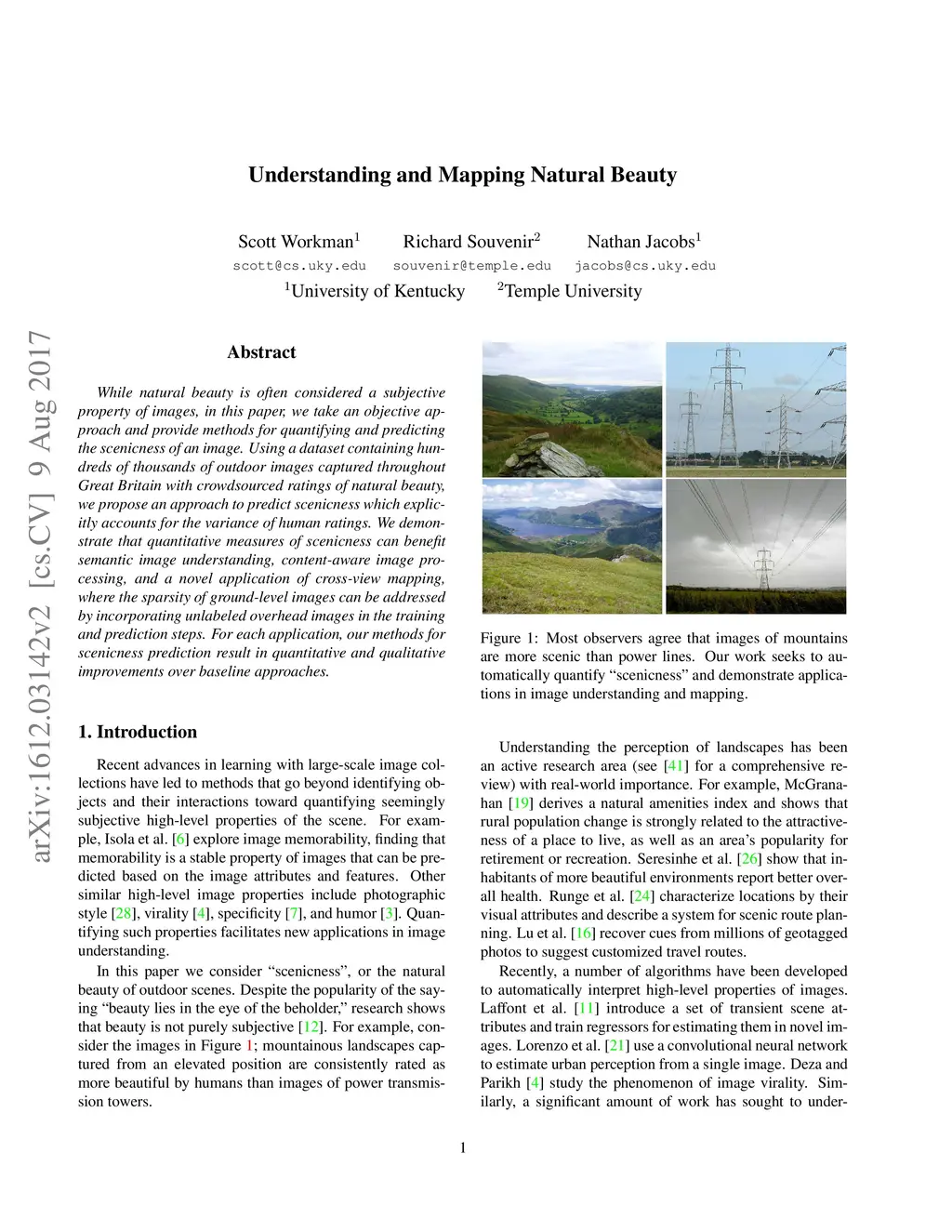While natural beauty is often considered a subjective property of images, in this paper, we take an objective approach and provide methods for quantifying and predicting the scenicness of an image. Using a dataset containing hundreds of thousands of outdoor images captured throughout Great Britain with crowdsourced ratings of natural beauty, we propose an approach to predict scenicness which explicitly accounts for the variance of human ratings. We demonstrate that quantitative measures of scenicness can benefit semantic image understanding, content-aware image processing, and a novel application of cross-view mapping, where the sparsity of ground-level images can be addressed by incorporating unlabeled overhead images in the training and prediction steps. For each application, our methods for scenicness prediction result in quantitative and qualitative improvements over baseline approaches.