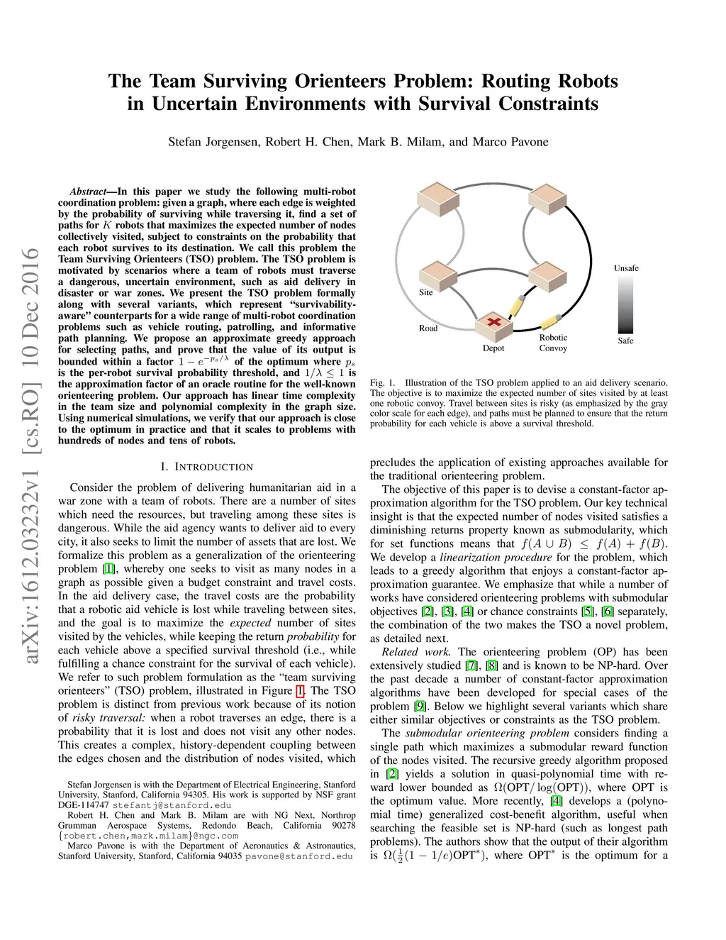 In this paper we study the following multi-robot coordination problem: given a graph, where each edge is weighted by the probability of surviving while traversing it, find a set of paths for robots that maximizes the expected number of nodes collectively visited, subject to constraints on the probability that each robot survives to its destination. We call this problem the Team Surviving Orienteers (TSO) problem. The TSO problem is motivated by scenarios where a team of robots must traverse a dangerous, uncertain environment, such as aid delivery in disaster or war zones. We present the TSO problem formally along with several variants, which represent "survivability-aware" counterparts for a wide range of multi-robot coordination problems such as vehicle routing, patrolling, and informative path planning. We propose an approximate greedy approach for selecting paths, and prove that the value of its output is bounded within a factor of the optimum where is the per-robot survival probability threshold, and is the approximation factor of an oracle routine for the well-known orienteering problem. Our approach has linear time complexity in the team size and polynomial complexity in the graph size. Using numerical simulations, we verify that our approach is close to the optimum in practice and that it scales to problems with hundreds of nodes and tens of robots.