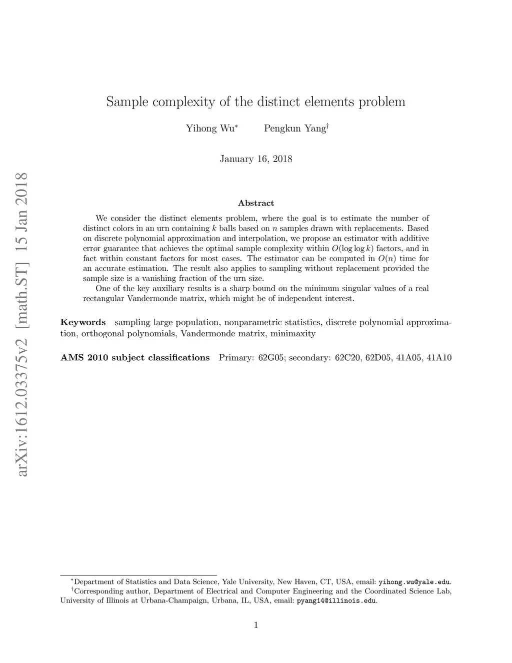 We consider the distinct elements problem, where the goal is to estimate the number of distinct colors in an urn containing $ k $ balls based on samples drawn with replacements. Based on discrete polynomial approximation and interpolation, we propose an estimator with additive error guarantee that achieves the optimal sample complexity within factors, and in fact within constant factors for most cases. The estimator can be computed in time for an accurate estimation. The result also applies to sampling without replacement provided the sample size is a vanishing fraction of the urn size. One of the key auxiliary results is a sharp bound on the minimum singular values of a real rectangular Vandermonde matrix, which might be of independent interest.
