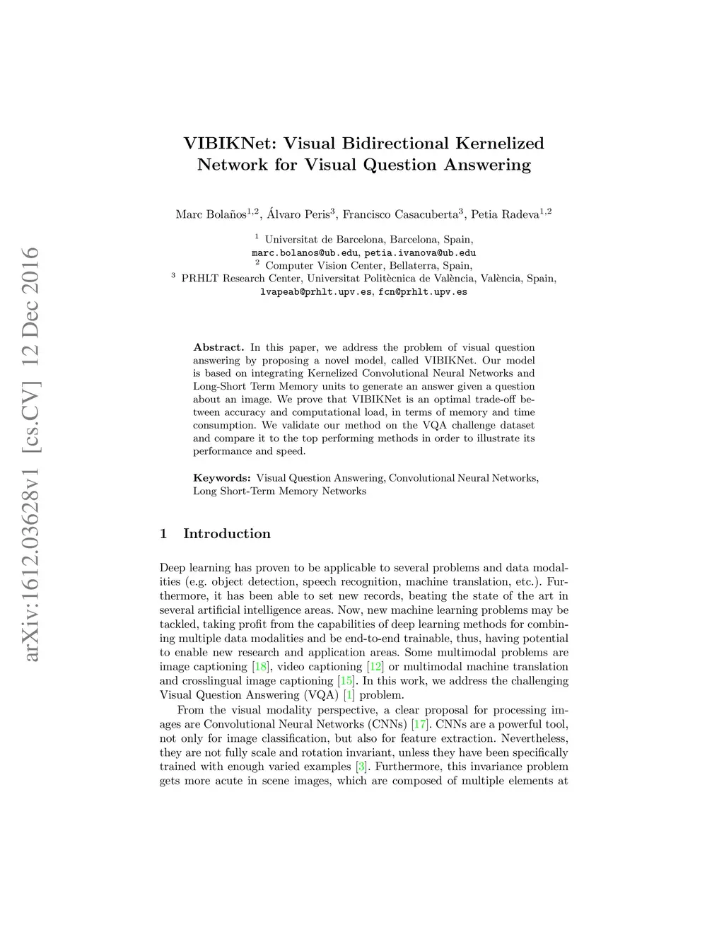 In this paper, we address the problem of visual question answering by proposing a novel model, called VIBIKNet. Our model is based on integrating Kernelized Convolutional Neural Networks and Long-Short Term Memory units to generate an answer given a question about an image. We prove that VIBIKNet is an optimal trade-off between accuracy and computational load, in terms of memory and time consumption. We validate our method on the VQA challenge dataset and compare it to the top performing methods in order to illustrate its performance and speed.
