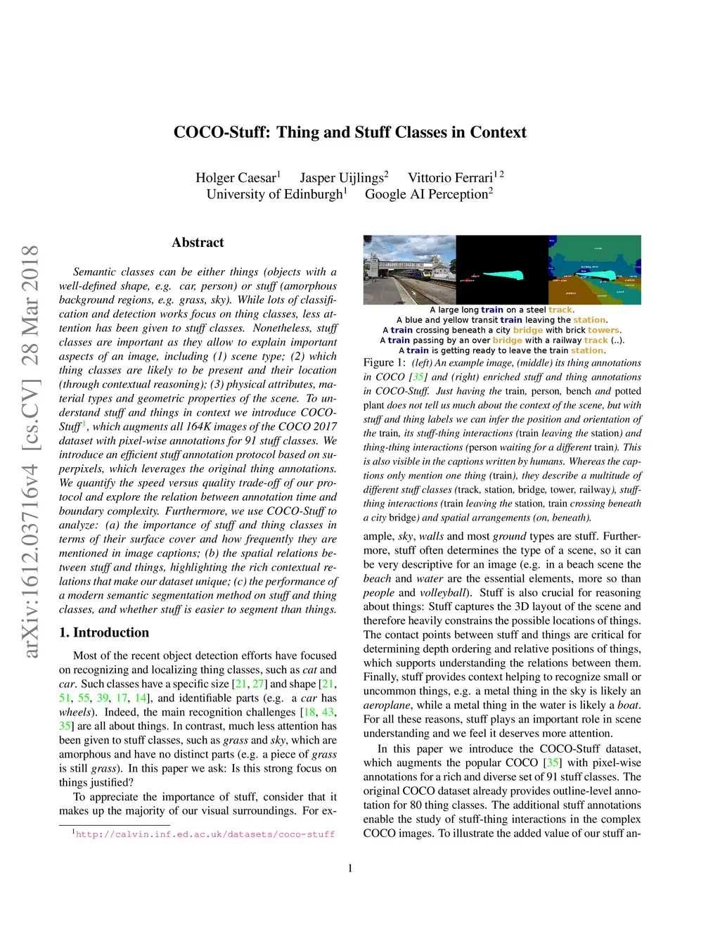 Semantic classes can be either things (objects with a well-defined shape, e.g. car, person) or stuff (amorphous background regions, e.g. grass, sky). While lots of classification and detection works focus on thing classes, less attention has been given to stuff classes. Nonetheless, stuff classes are important as they allow to explain important aspects of an image, including (1) scene type; (2) which thing classes are likely to be present and their location (through contextual reasoning); (3) physical attributes, material types and geometric properties of the scene. To understand stuff and things in context we introduce COCO-Stuff, which augments all 164K images of the COCO 2017 dataset with pixel-wise annotations for 91 stuff classes. We introduce an efficient stuff annotation protocol based on superpixels, which leverages the original thing annotations. We quantify the speed versus quality trade-off of our protocol and explore the relation between annotation time and boundary complexity. Furthermore, we use COCO-Stuff to analyze: (a) the importance of stuff and thing classes in terms of their surface cover and how frequently they are mentioned in image captions; (b) the spatial relations between stuff and things, highlighting the rich contextual relations that make our dataset unique; (c) the performance of a modern semantic segmentation method on stuff and thing classes, and whether stuff is easier to segment than things.
