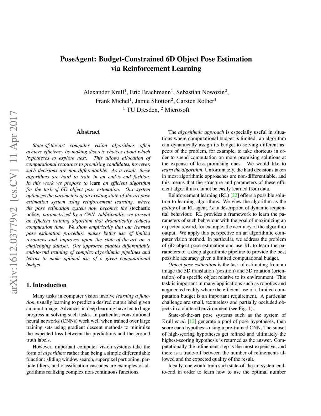 State-of-the-art computer vision algorithms often achieve efficiency by making discrete choices about which hypotheses to explore next. This allows allocation of computational resources to promising candidates, however, such decisions are non-differentiable. As a result, these algorithms are hard to train in an end-to-end fashion. In this work we propose to learn an efficient algorithm for the task of 6D object pose estimation. Our system optimizes the parameters of an existing state-of-the art pose estimation system using reinforcement learning, where the pose estimation system now becomes the stochastic policy, parametrized by a CNN. Additionally, we present an efficient training algorithm that dramatically reduces computation time. We show empirically that our learned pose estimation procedure makes better use of limited resources and improves upon the state-of-the-art on a challenging dataset. Our approach enables differentiable end-to-end training of complex algorithmic pipelines and learns to make optimal use of a given computational budget.