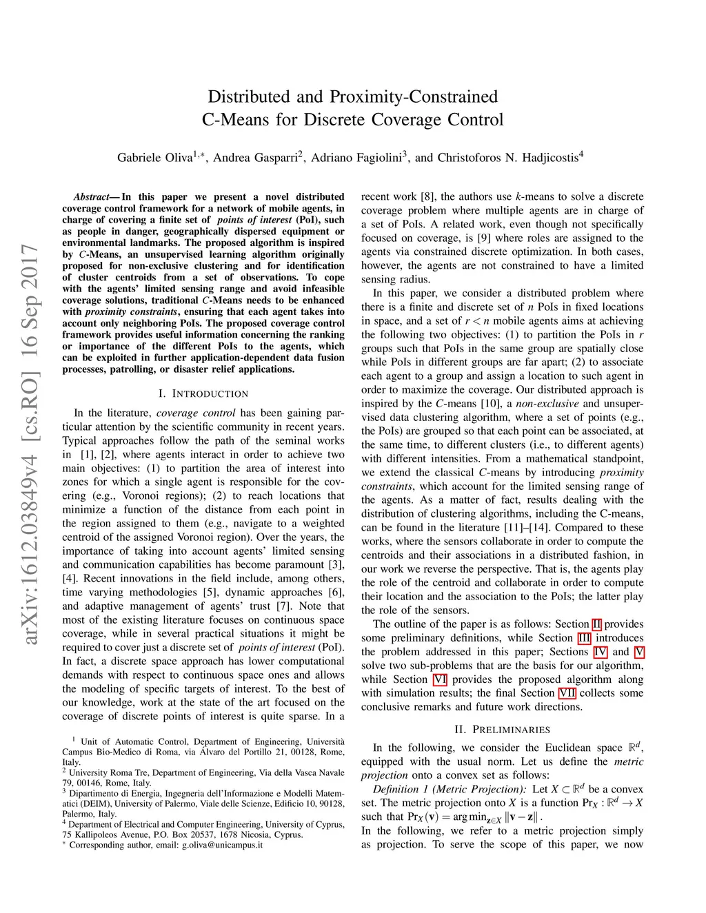 In this paper we present a novel distributed coverage control framework for a network of mobile agents, in charge of covering a finite set of points of interest (PoI), such as people in danger, geographically dispersed equipment or environmental landmarks. The proposed algorithm is inspired by C-Means, an unsupervised learning algorithm originally proposed for non-exclusive clustering and for identification of cluster centroids from a set of observations. To cope with the agents' limited sensing range and avoid infeasible coverage solutions, traditional C-Means needs to be enhanced with proximity constraints, ensuring that each agent takes into account only neighboring PoIs. The proposed coverage control framework provides useful information concerning the ranking or importance of the different PoIs to the agents, which can be exploited in further application-dependent data fusion processes, patrolling, or disaster relief applications.