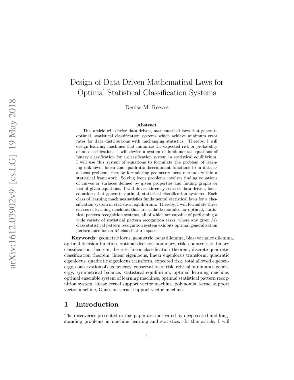 This article will devise data-driven, mathematical laws that generate optimal, statistical classification systems which achieve minimum error rates for data distributions with unchanging statistics. Thereby, I will design learning machines that minimize the expected risk or probability of misclassification. I will devise a system of fundamental equations of binary classification for a classification system in statistical equilibrium. I will use this system of equations to formulate the problem of learning unknown, linear and quadratic discriminant functions from data as a locus problem, thereby formulating geometric locus methods within a statistical framework. Solving locus problems involves finding equations of curves or surfaces defined by given properties and finding graphs or loci of given equations. I will devise three systems of data-driven, locus equations that generate optimal, statistical classification systems. Each class of learning machines satisfies fundamental statistical laws for a classification system in statistical equilibrium. Thereby, I will formulate three classes of learning machines that are scalable modules for optimal, statistical pattern recognition systems, all of which are capable of performing a wide variety of statistical pattern recognition tasks, where any given M-class statistical pattern recognition system exhibits optimal generalization performance for an M-class feature space.