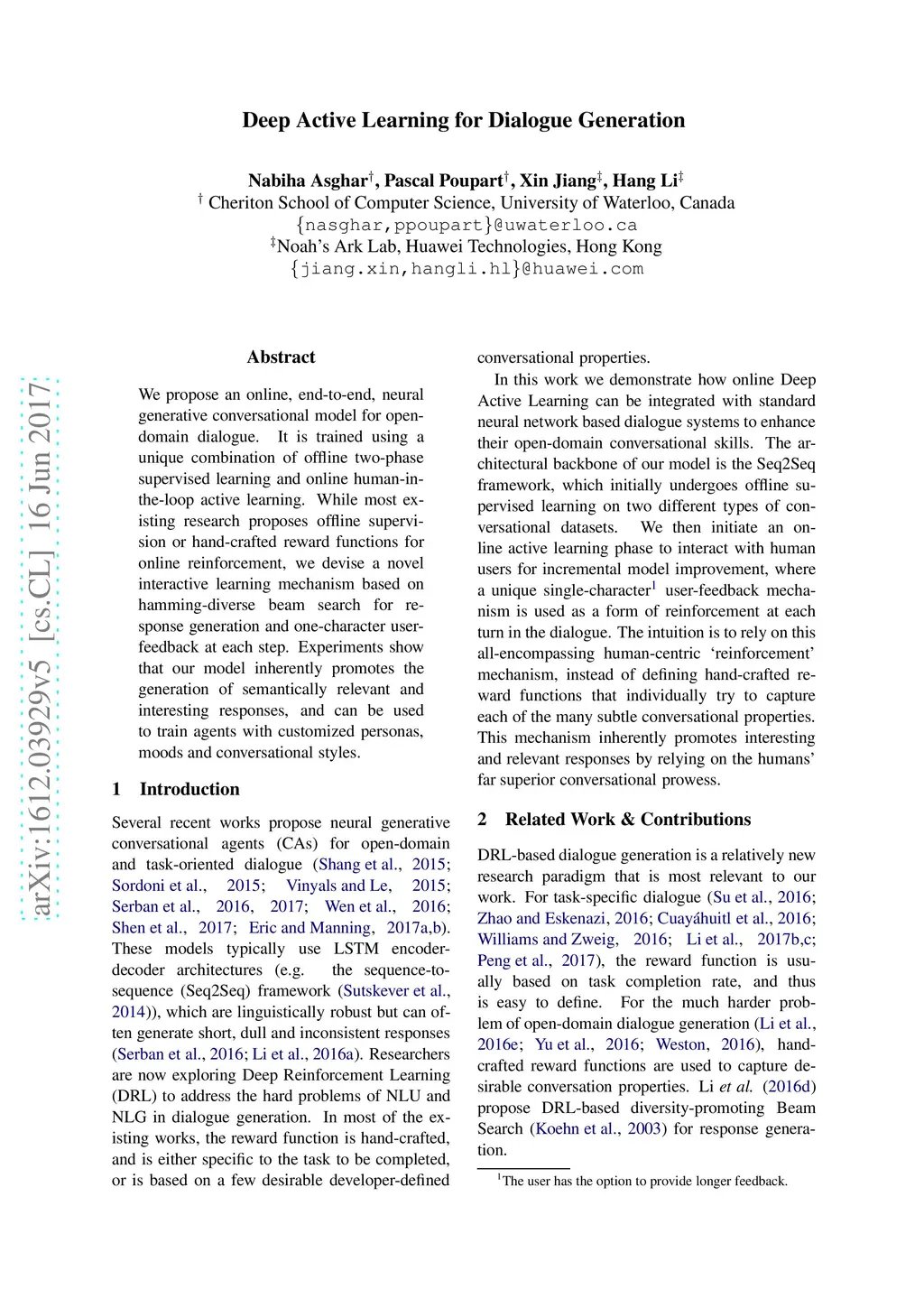 We propose an online, end-to-end, neural generative conversational model for open-domain dialogue. It is trained using a unique combination of offline two-phase supervised learning and online human-in-the-loop active learning. While most existing research proposes offline supervision or hand-crafted reward functions for online reinforcement, we devise a novel interactive learning mechanism based on hamming-diverse beam search for response generation and one-character user-feedback at each step. Experiments show that our model inherently promotes the generation of semantically relevant and interesting responses, and can be used to train agents with customized personas, moods and conversational styles.