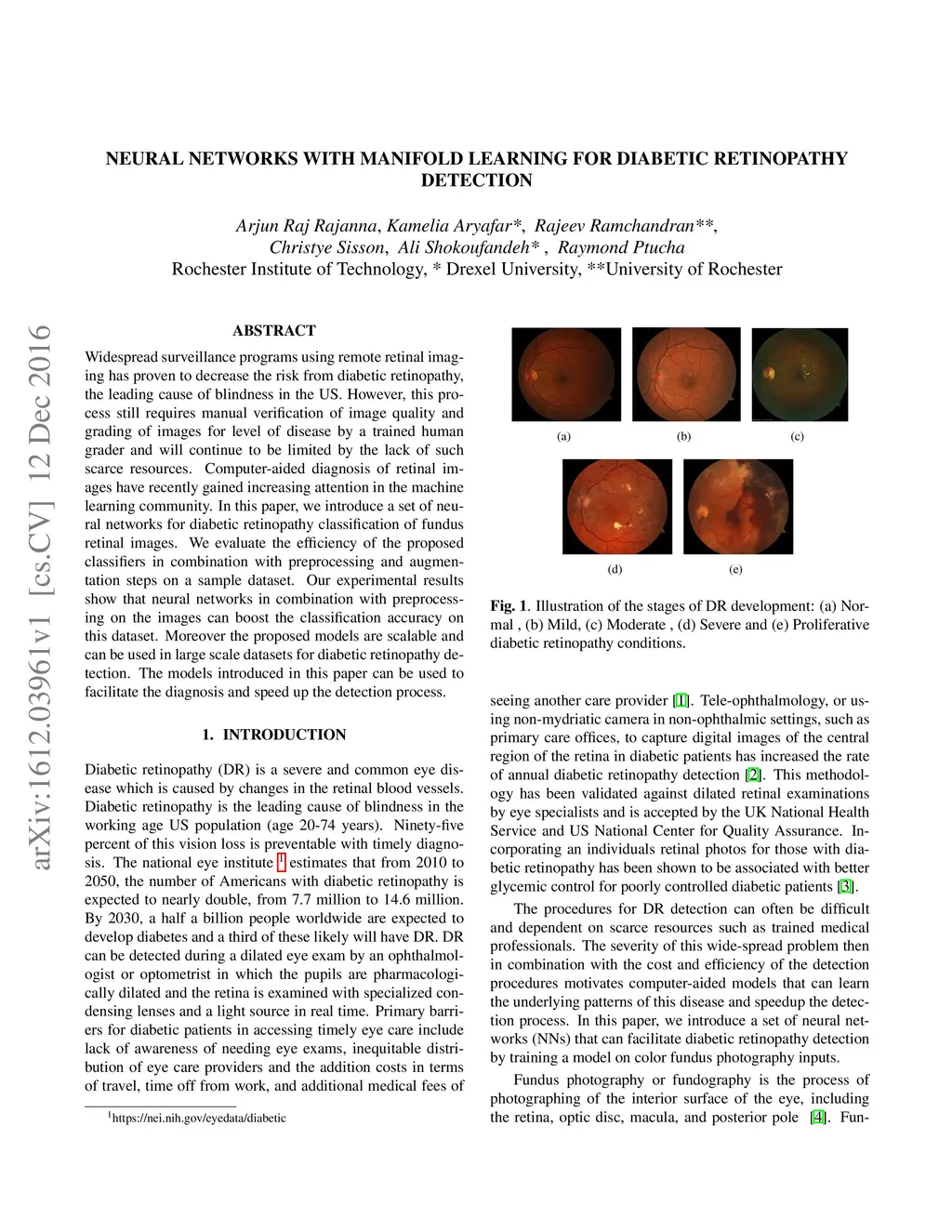 Neural Networks with Manifold Learning for Diabetic Retinopathy