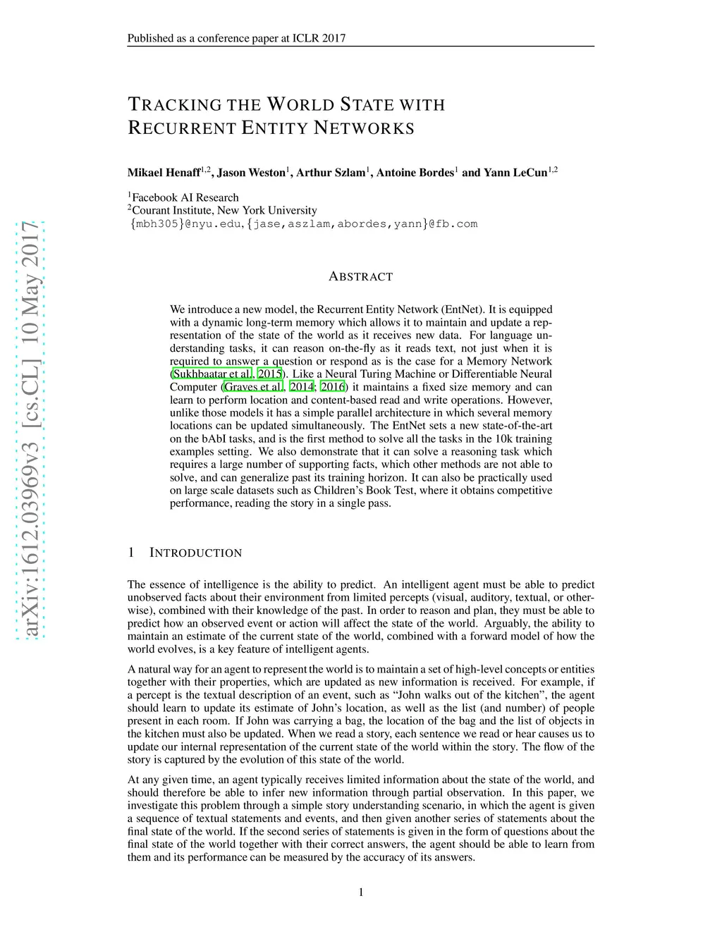 Tracking the World State with Recurrent Entity Networks