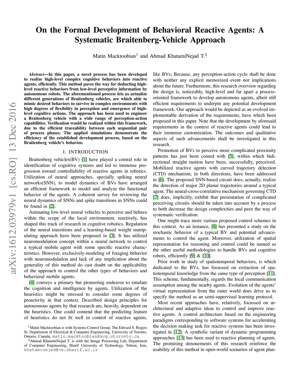 In this paper, a novel process has been developed to realize high-level complex cognitive behaviors into reactive agents, efficiently. This method paves the way for deducting high-level reactive behaviors from low-level perceptive information by autonomous robots. The aforementioned process lets us actualize different generations of Braitenberg vehicles, are which able to mimic desired behaviors to survive in complex environments with high degrees of flexibility in perception and emergence of high-level cognitive actions. The approach has been used to engineer a Braitenberg vehicle with a wide range of perception-action capabilities. Verification would be realized within this framework, due to the efficient traceability between each sequential pair of process phases. The applied simulations demonstrate the efficiency of the established development process, based on the Braitenberg vehicle's behavior.