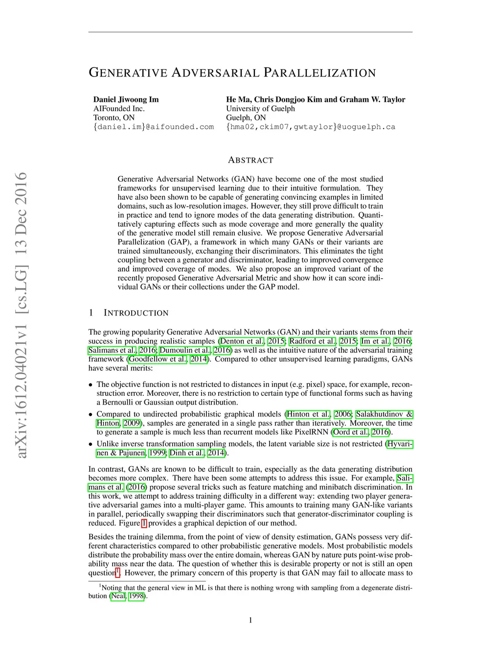 Generative Adversarial Networks have become one of the most studied frameworks for unsupervised learning due to their intuitive formulation. They have also been shown to be capable of generating convincing examples in limited domains, such as low-resolution images. However, they still prove difficult to train in practice and tend to ignore modes of the data generating distribution. Quantitatively capturing effects such as mode coverage and more generally the quality of the generative model still remain elusive. We propose Generative Adversarial Parallelization, a framework in which many GANs or their variants are trained simultaneously, exchanging their discriminators. This eliminates the tight coupling between a generator and discriminator, leading to improved convergence and improved coverage of modes. We also propose an improved variant of the recently proposed Generative Adversarial Metric and show how it can score individual GANs or their collections under the GAP model.