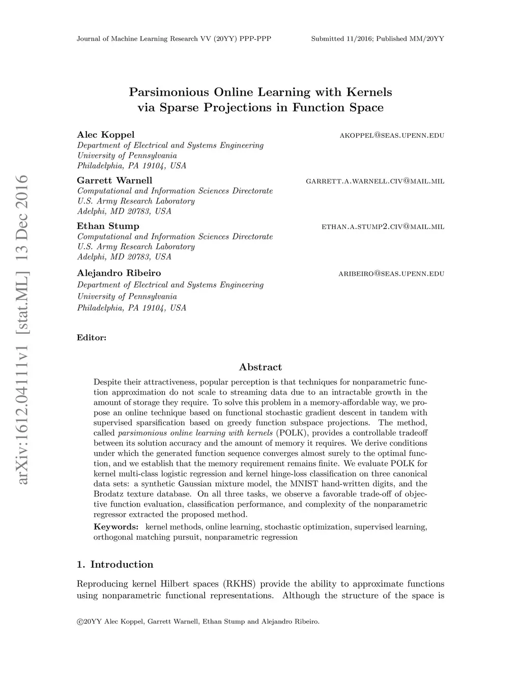 Despite their attractiveness, popular perception is that techniques for nonparametric function approximation do not scale to streaming data due to an intractable growth in the amount of storage they require. To solve this problem in a memory-affordable way, we propose an online technique based on functional stochastic gradient descent in tandem with supervised sparsification based on greedy function subspace projections. The method, called parsimonious online learning with kernels (POLK), provides a controllable tradeoff? between its solution accuracy and the amount of memory it requires. We derive conditions under which the generated function sequence converges almost surely to the optimal function, and we establish that the memory requirement remains finite. We evaluate POLK for kernel multi-class logistic regression and kernel hinge-loss classification on three canonical data sets: a synthetic Gaussian mixture model, the MNIST hand-written digits, and the Brodatz texture database. On all three tasks, we observe a favorable tradeoff of objective function evaluation, classification performance, and complexity of the nonparametric regressor extracted the proposed method.