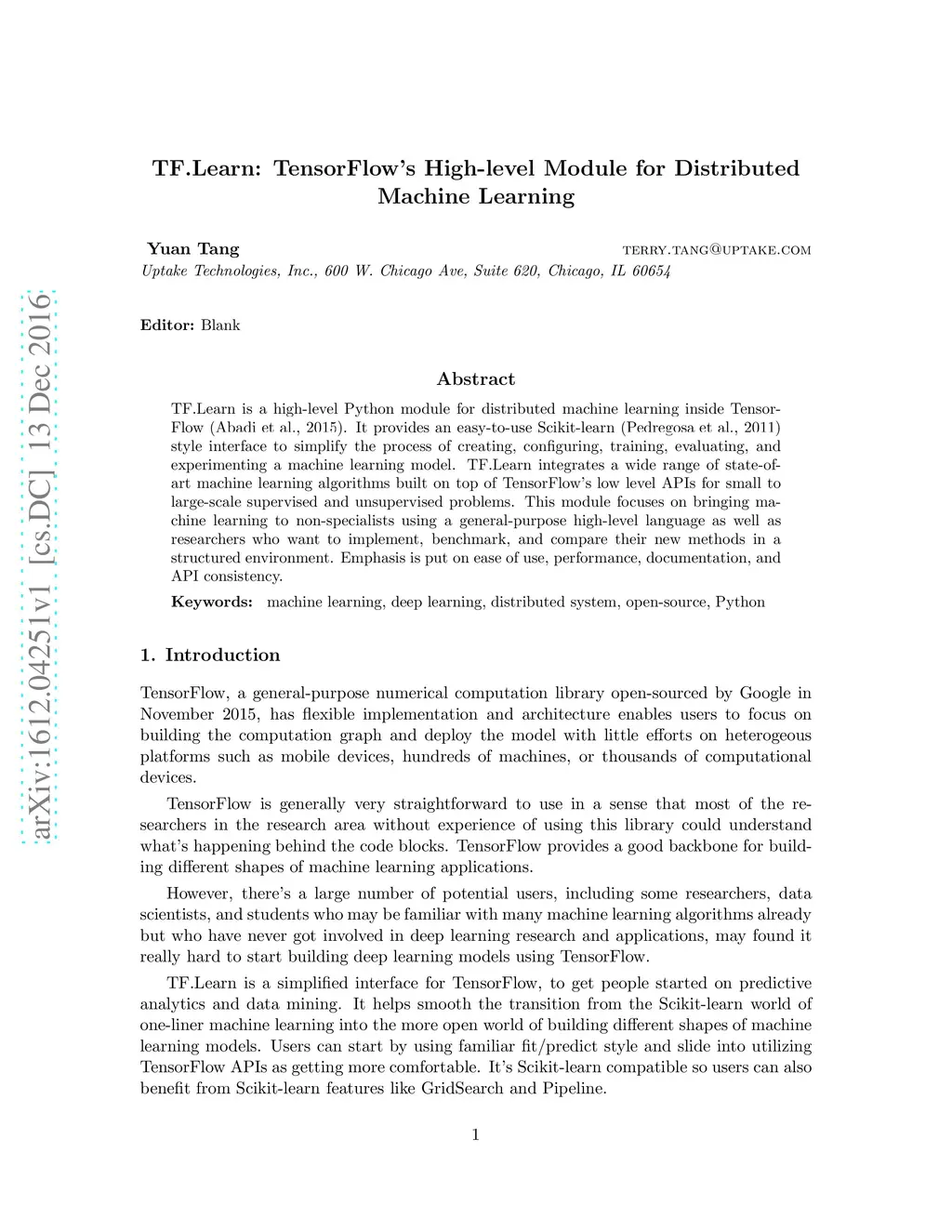 TF.Learn is a high-level Python module for distributed machine learning inside TensorFlow. It provides an easy-to-use Scikit-learn style interface to simplify the process of creating, configuring, training, evaluating, and experimenting a machine learning model. TF.Learn integrates a wide range of state-of-art machine learning algorithms built on top of TensorFlow's low level APIs for small to large-scale supervised and unsupervised problems. This module focuses on bringing machine learning to non-specialists using a general-purpose high-level language as well as researchers who want to implement, benchmark, and compare their new methods in a structured environment. Emphasis is put on ease of use, performance, documentation, and API consistency.