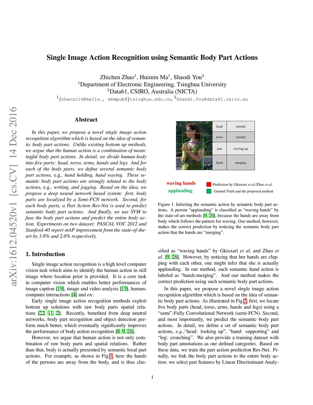In this paper, we propose a novel single image action recognition algorithm which is based on the idea of semantic body part actions. Unlike existing bottom up methods, we argue that the human action is a combination of meaningful body part actions. In detail, we divide human body into five parts: head, torso, arms, hands and legs. And for each of the body parts, we define several semantic body part actions, e.g., hand holding, hand waving. These semantic body part actions are strongly related to the body actions, e.g., writing, and jogging. Based on the idea, we propose a deep neural network based system: first, body parts are localized by a Semi-FCN network. Second, for each body parts, a Part Action Res-Net is used to predict semantic body part actions. And finally, we use SVM to fuse the body part actions and predict the entire body action. Experiments on two dataset: PASCAL VOC 2012 and Stanford-40 report mAP improvement from the state-of-the-art by 3.8% and 2.6% respectively.