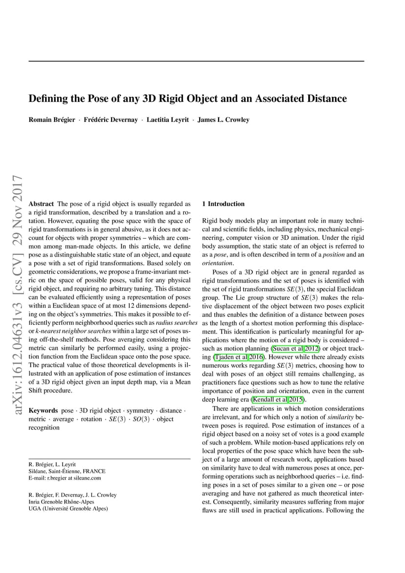 The pose of a rigid object is usually regarded as a rigid transformation, described by a translation and a rotation. However, equating the pose space with the space of rigid transformations is in general abusive, as it does not account for objects with proper symmetries -- which are common among man-made objects.In this article, we define pose as a distinguishable static state of an object, and equate a pose with a set of rigid transformations. Based solely on geometric considerations, we propose a frame-invariant metric on the space of possible poses, valid for any physical rigid object, and requiring no arbitrary tuning. This distance can be evaluated efficiently using a representation of poses within an Euclidean space of at most 12 dimensions depending on the object's symmetries. This makes it possible to efficiently perform neighborhood queries such as radius searches or k-nearest neighbor searches within a large set of poses using off-the-shelf methods. Pose averaging considering this metric can similarly be performed easily, using a projection function from the Euclidean space onto the pose space. The practical value of those theoretical developments is illustrated with an application of pose estimation of instances of a 3D rigid object given an input depth map, via a Mean Shift procedure.