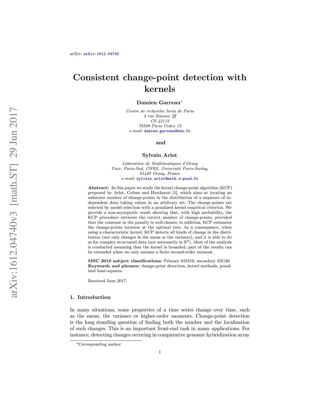 In this paper we study the kernel change-point algorithm (KCP) proposed by Arlot, Celisse and Harchaoui (2012), which aims at locating an unknown number of change-points in the distribution of a sequence of independent data taking values in an arbitrary set. The change-points are selected by model selection with a penalized kernel empirical criterion. We provide a non-asymptotic result showing that, with high probability, the KCP procedure retrieves the correct number of change-points, provided that the constant in the penalty is well-chosen; in addition, KCP estimates the change-points location at the optimal rate. As a consequence, when using a characteristic kernel, KCP detects all kinds of change in the distribution (not only changes in the mean or the variance), and it is able to do so for complex structured data (not necessarily in ). Most of the analysis is conducted assuming that the kernel is bounded; part of the results can be extended when we only assume a finite second-order moment.