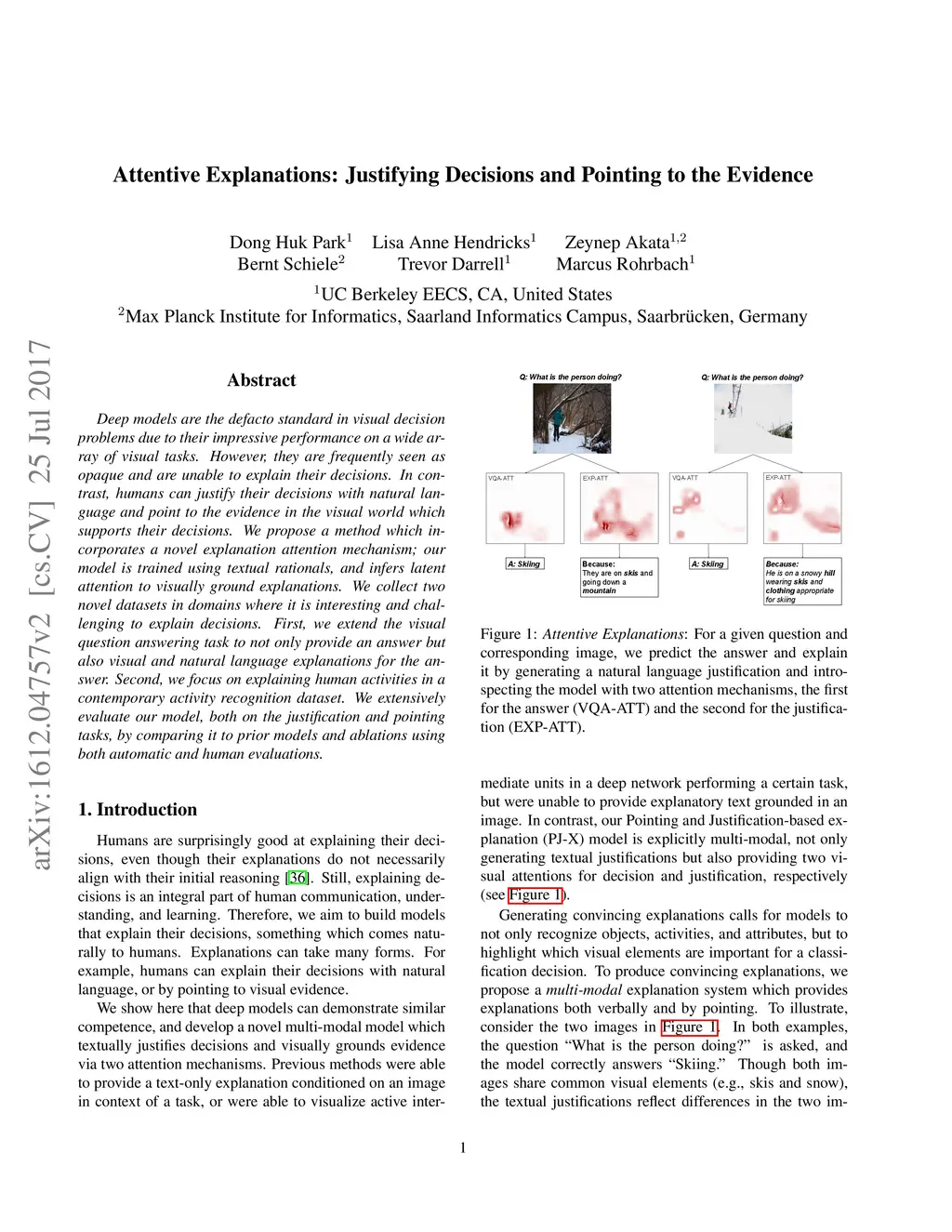 Deep models are the defacto standard in visual decision models due to their impressive performance on a wide array of visual tasks. However, they are frequently seen as opaque and are unable to explain their decisions. In contrast, humans can justify their decisions with natural language and point to the evidence in the visual world which led to their decisions. We postulate that deep models can do this as well and propose our Pointing and Justification (PJ-X) model which can justify its decision with a sentence and point to the evidence by introspecting its decision and explanation process using an attention mechanism. Unfortunately there is no dataset available with reference explanations for visual decision making. We thus collect two datasets in two domains where it is interesting and challenging to explain decisions. First, we extend the visual question answering task to not only provide an answer but also a natural language explanation for the answer. Second, we focus on explaining human activities which is traditionally more challenging than object classification. We extensively evaluate our PJ-X model, both on the justification and pointing tasks, by comparing it to prior models and ablations using both automatic and human evaluations.