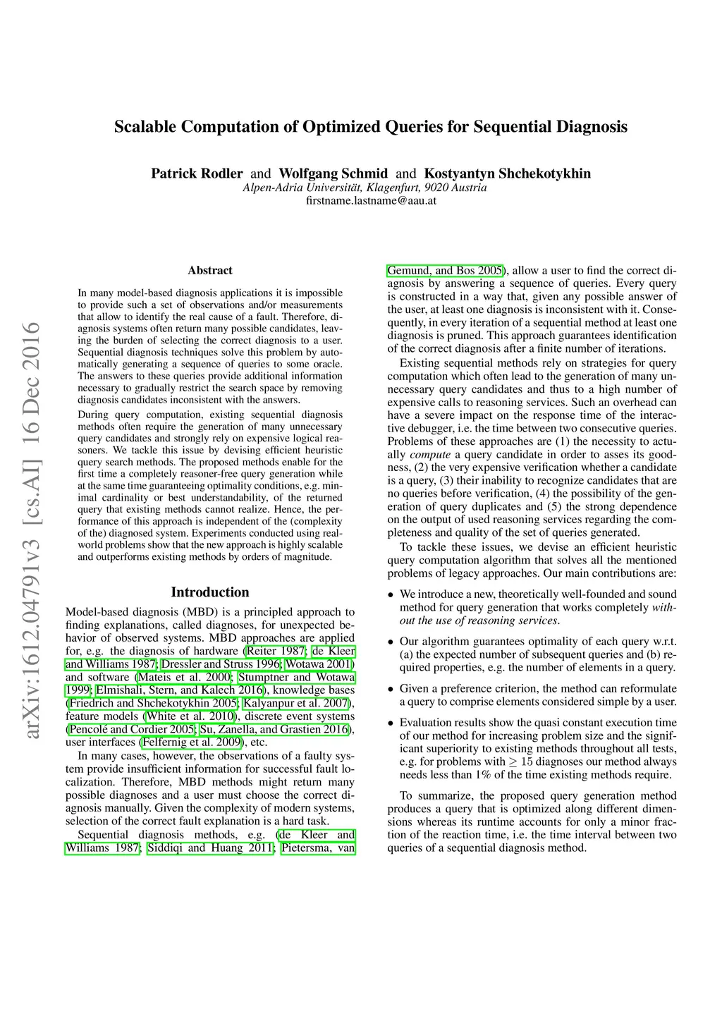 In many model-based diagnosis applications it is impossible to provide such a set of observations and/or measurements that allow to identify the real cause of a fault. Therefore, diagnosis systems often return many possible candidates, leaving the burden of selecting the correct diagnosis to a user. Sequential diagnosis techniques solve this problem by automatically generating a sequence of queries to some oracle. The answers to these queries provide additional information necessary to gradually restrict the search space by removing diagnosis candidates inconsistent with the answers. During query computation, existing sequential diagnosis methods often require the generation of many unnecessary query candidates and strongly rely on expensive logical reasoners. We tackle this issue by devising efficient heuristic query search methods. The proposed methods enable for the first time a completely reasoner-free query generation while at the same time guaranteeing optimality conditions, e.g. minimal cardinality or best understandability, of the returned query that existing methods cannot realize. Hence, the performance of this approach is independent of the (complexity of the) diagnosed system. Experiments conducted using real-world problems show that the new approach is highly scalable and outperforms existing methods by orders of magnitude.