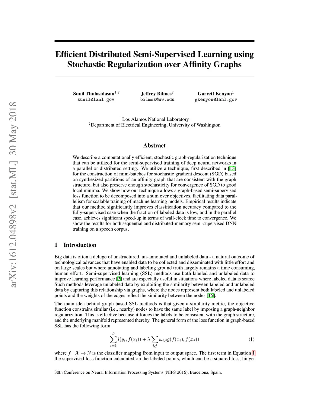 We describe a computationally efficient, stochastic graph-regularization technique that can be utilized for the semi-supervised training of deep neural networks in a parallel or distributed setting. We utilize a technique, first described in [13] for the construction of mini-batches for stochastic gradient descent (SGD) based on synthesized partitions of an affinity graph that are consistent with the graph structure, but also preserve enough stochasticity for convergence of SGD to good local minima. We show how our technique allows a graph-based semi-supervised loss function to be decomposed into a sum over objectives, facilitating data parallelism for scalable training of machine learning models. Empirical results indicate that our method significantly improves classification accuracy compared to the fully-supervised case when the fraction of labeled data is low, and in the parallel case, achieves significant speed-up in terms of wall-clock time to convergence. We show the results for both sequential and distributed-memory semi-supervised DNN training on a speech corpus.