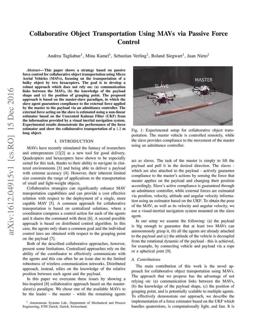 Collaborative Object Transportation Using MAVs via Passive Force Control