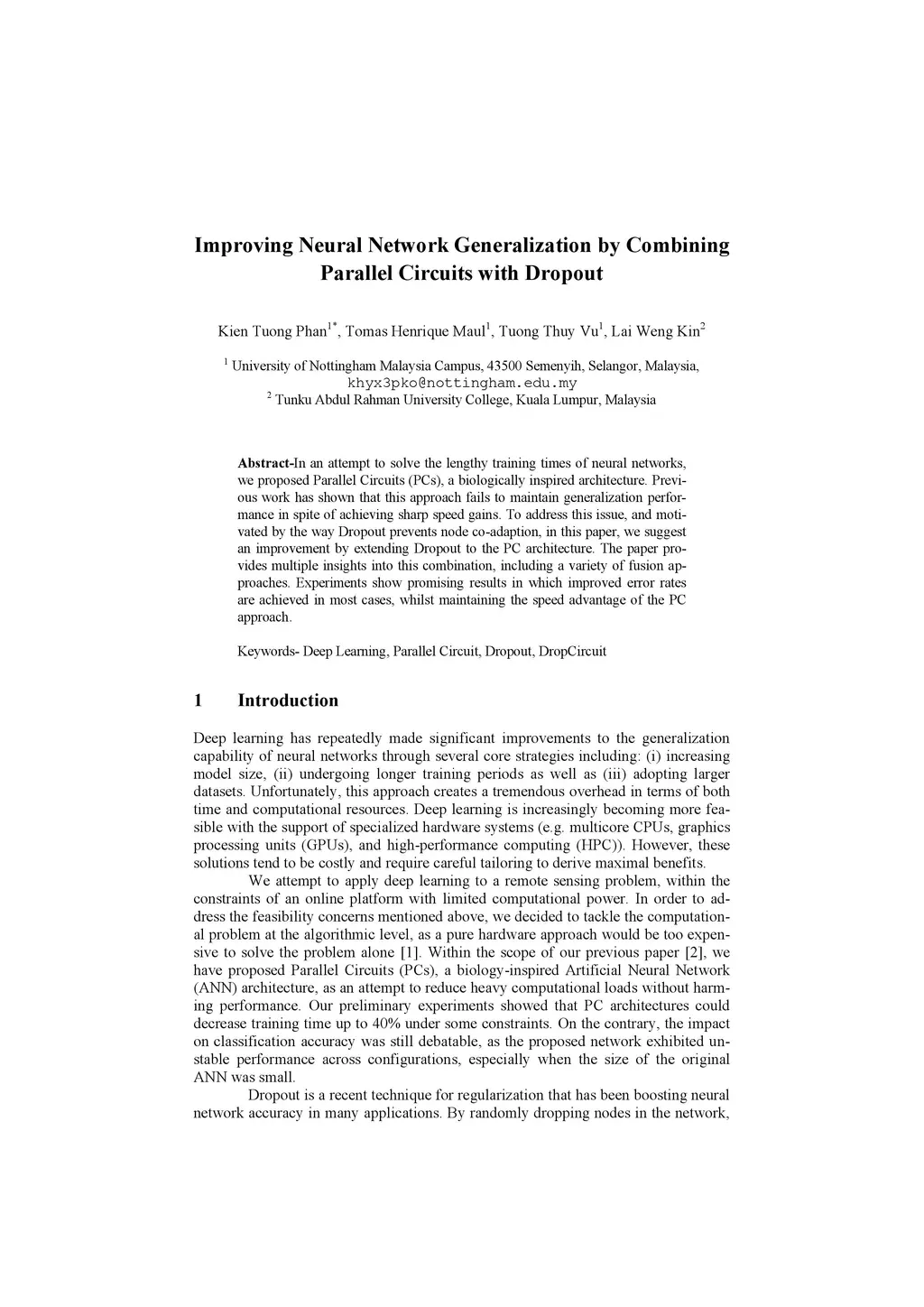 In an attempt to solve the lengthy training times of neural networks, we proposed Parallel Circuits (PCs), a biologically inspired architecture. Previous work has shown that this approach fails to maintain generalization performance in spite of achieving sharp speed gains. To address this issue, and motivated by the way Dropout prevents node co-adaption, in this paper, we suggest an improvement by extending Dropout to the PC architecture. The paper provides multiple insights into this combination, including a variety of fusion approaches. Experiments show promising results in which improved error rates are achieved in most cases, whilst maintaining the speed advantage of the PC approach.