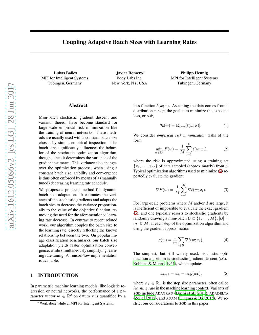 Mini-batch stochastic gradient descent and variants thereof have become standard for large-scale empirical risk minimization like the training of neural networks. These methods are usually used with a constant batch size chosen by simple empirical inspection. The batch size significantly influences the behavior of the stochastic optimization algorithm, though, since it determines the variance of the gradient estimates. This variance also changes over the optimization process; when using a constant batch size, stability and convergence is thus often enforced by means of a (manually tuned) decreasing learning rate schedule. We propose a practical method for dynamic batch size adaptation. It estimates the variance of the stochastic gradients and adapts the batch size to decrease the variance proportionally to the value of the objective function, removing the need for the aforementioned learning rate decrease. In contrast to recent related work, our algorithm couples the batch size to the learning rate, directly reflecting the known relationship between the two. On popular image classification benchmarks, our batch size adaptation yields faster optimization convergence, while simultaneously simplifying learning rate tuning. A TensorFlow implementation is available.